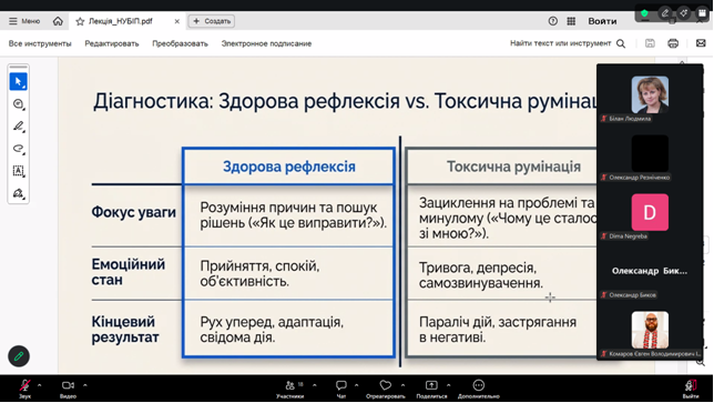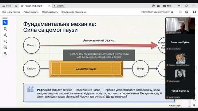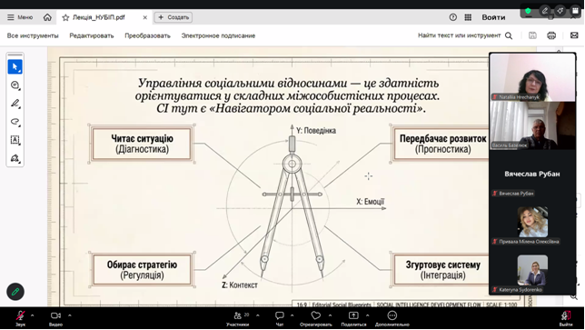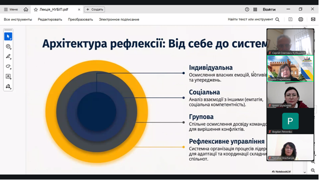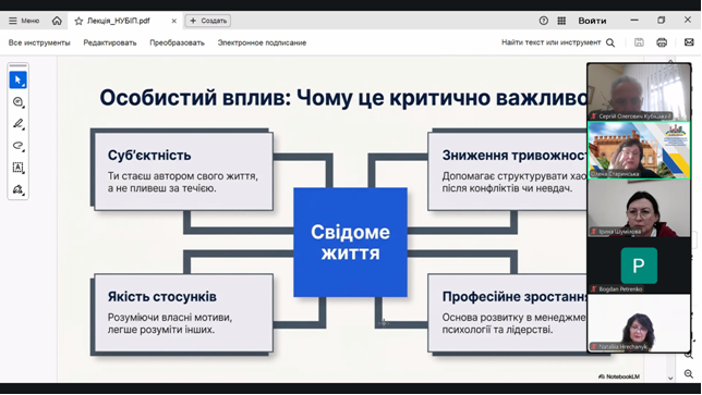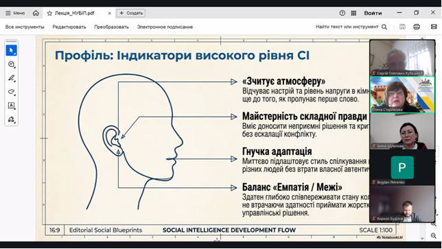 Лекція мала чітко виражений науково-практичний характер. У межах викладу було поєднано теоретико-методологічні положення сучасної психології управління, концепції соціального інтелекту та підходи до розвитку рефлексивної компетентності керівника з практичними кейсами функціонування освітніх організацій. Такий підхід забезпечив високий рівень прикладної цінності матеріалу та його адаптацію до професійних запитів майбутніх управлінців.