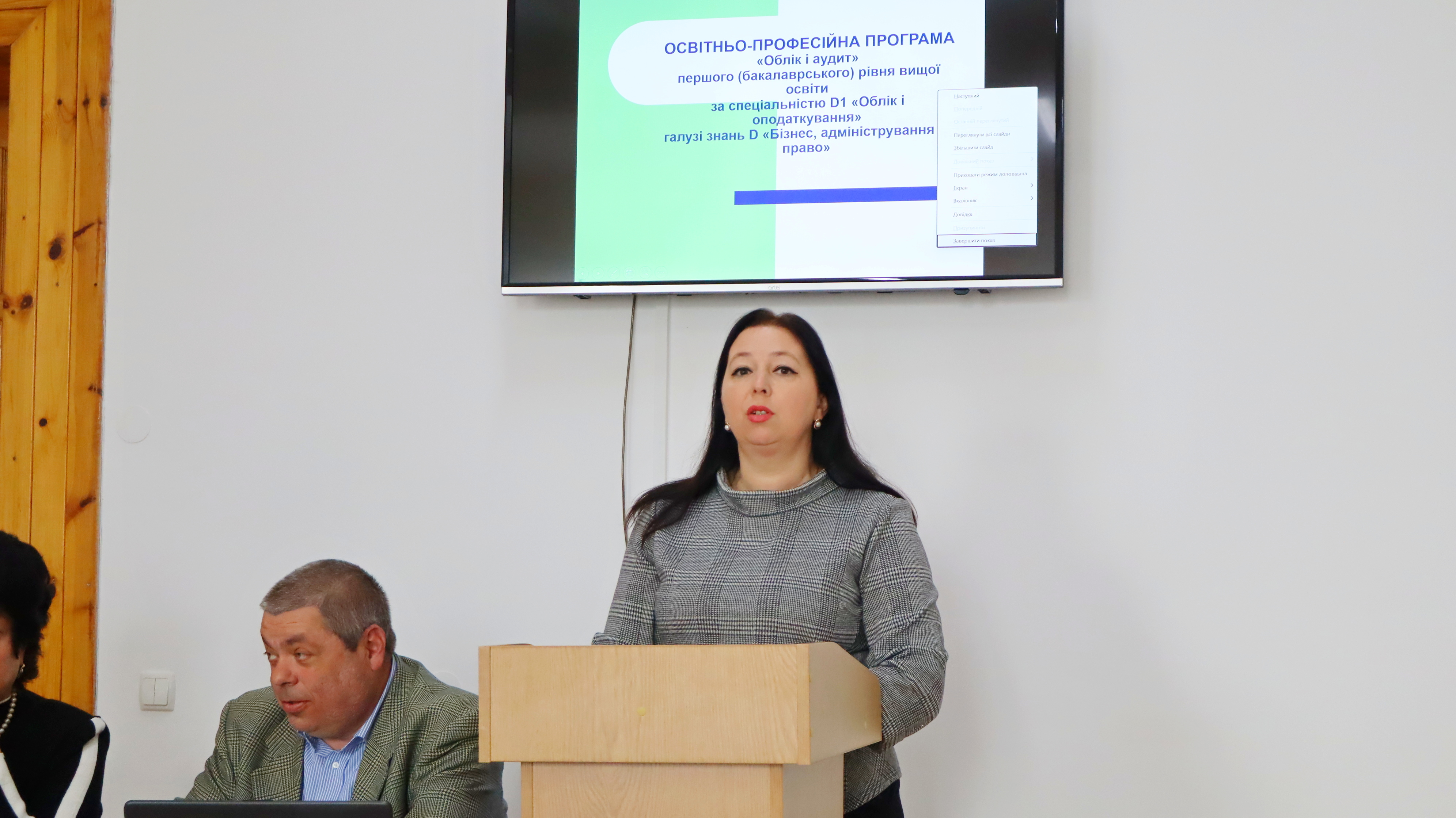 До обговорення освітньо-професійних програм долучилася студентка спеціальності «Облік і оподаткування», голова студентської ради факультету Ірина ДАНИЛІВ. Вона наголосила на активній участі здобувачів вищої освіти у процесі обговорення та прийняття рішень щодо вдосконалення освітнього процесу, передала позицію колег щодо вибіркових дисциплін і посилення практичного спрямування окремих дисциплін.