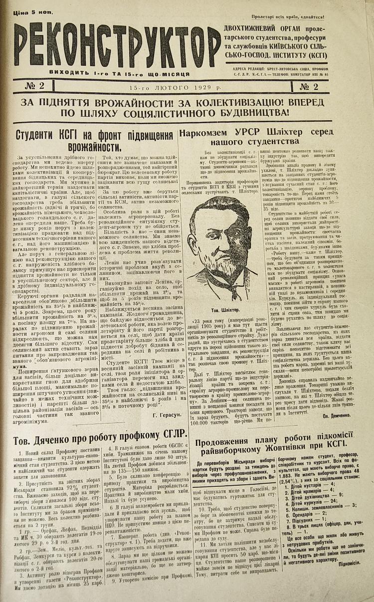 «Реконструктор: двотижневий орган пролетарського студентства, професури та службовців Київського сільськогосподарського інституту» — під такою назвою 29 січня 1929 року вийшов перший номер газети. До 1929 р. інформаційним органом Київського сільськогосподарського інституту був «стінний місячник», тобто актуальна інформація з життя навчального закладу подавалась один раз на місяць на папері великого розміру, який вивішували для всезагального огляду. «Реконструктор» був україномовним двотижневим часописом, який розповсюджувався на основі передплати («підписки»).