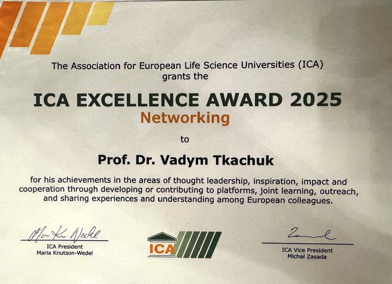 Національний університет біоресурсів і природокористування України здобув почесне міжнародне визнання - ректор Вадим ТКАЧУК нагороджений престижною відзнакою ICA Excellence Award у номінації ICA Networking. Урочисте вручення нагороди відбулося 16 жовтня 2025 року в ратуші міста Відня в межах 15-го Форуму ректорів та деканів Асоціації європейських університетів наук про життя ICA.
