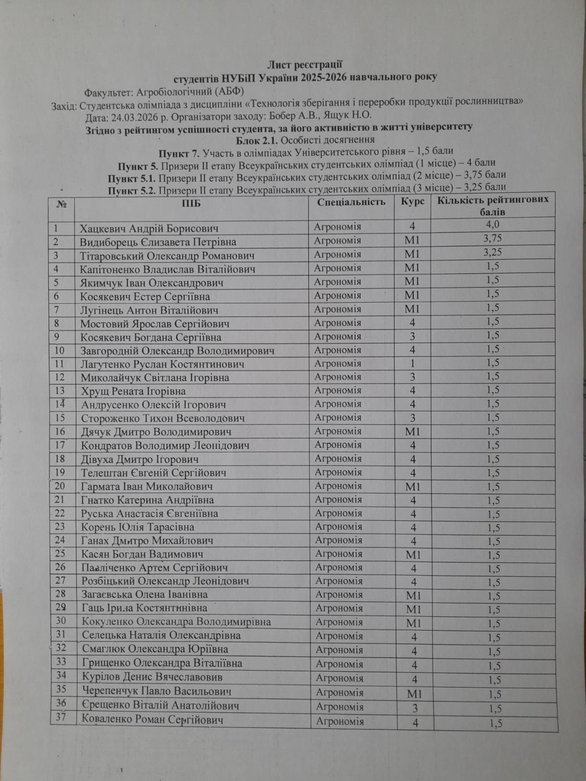 Результати I етапу студентської олімпіади з дисципліни «Технологія зберігання і переробки продукції рослинництва»