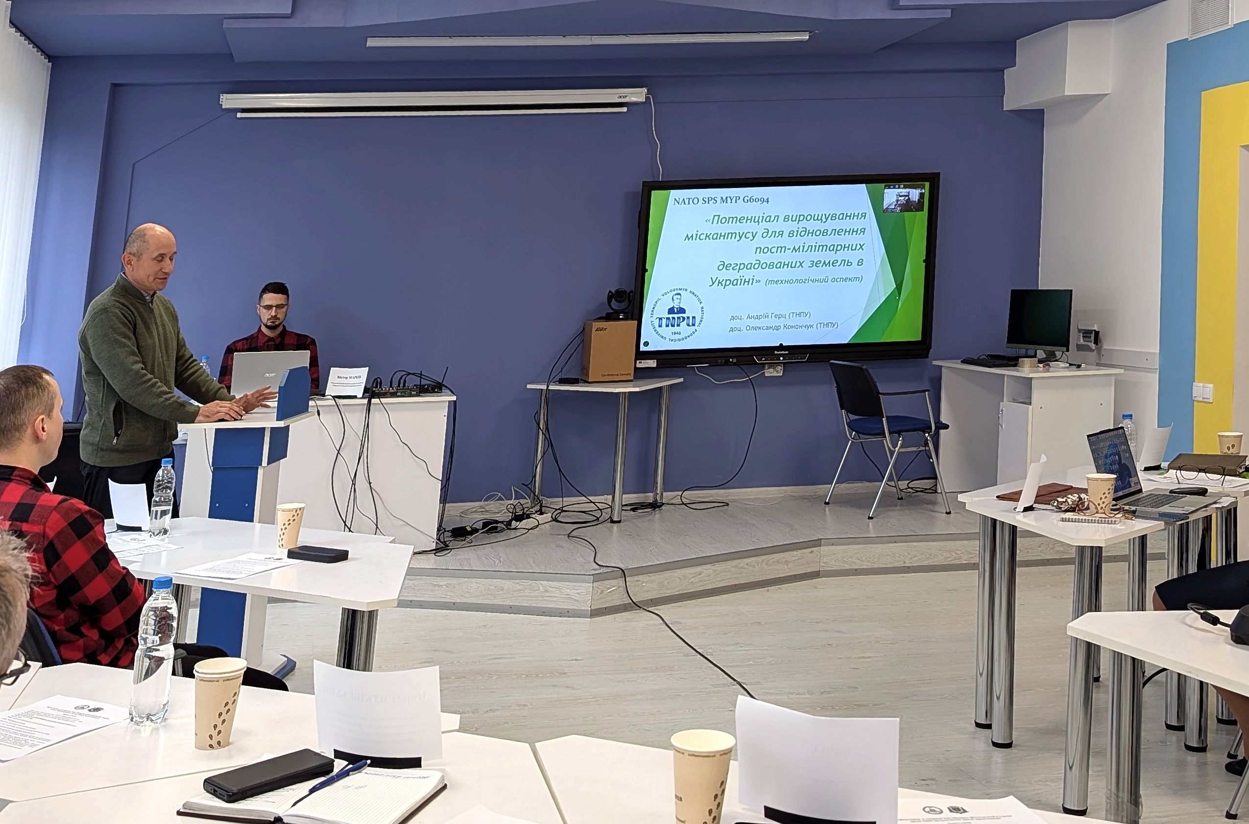 Під час зустрічі були представлені ключові доповіді, присвячені створенню Хабу та розвитку міскантус-фітотехнологій. Доц. Тетяна СТЕФАНОВСЬКА (НУБіП України), співдиректорка проєкту від країн-партнерів, представила концепцію створення «Міскантус Хабу Україна». Проф. Валентина ПІДЛІСЮК (UJEP, Чехія), директорка проєкту від країн НАТО (онлайн), поділилася досвідом упровадження передових міскантус-фітотехнологій. Доц. Андрій ГЕРЦ, директор проєкту від країн-партнерів, та доц. Олександр КОНОНЧУК (ТНПУ) висвітлили потенціал вирощування міскантусу для рекультивації поствійськових деградованих земель в Україні. Доц. Айгерім МАМІРОВА (Національний університет ім. Аль-Фарабі, Казахстан, онлайн) розповіла про використання біочару для підвищення ефективності міскантус-фітотехнологій.