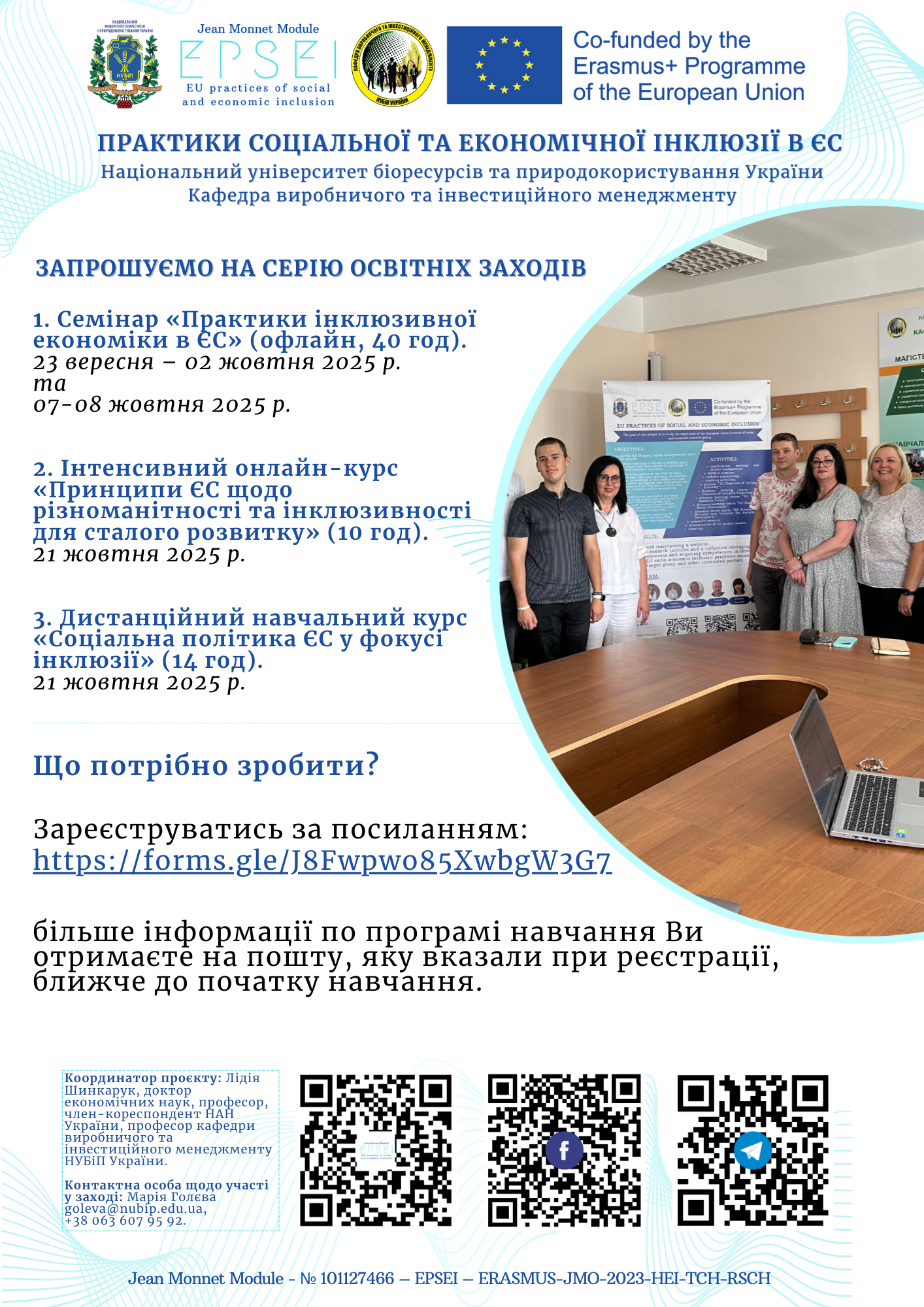 НУБІП України , а саме кафедра виробничого та інвестиційного менеджменту, в рамках імплементації проєкту Програми Європейського Союзу Еразмус+, модуль Жан Моне «Практики соціальної та економічної інклюзії в ЄС» (Jean Monnet Module 101127466 – EPSEI – ERASMUS-JMO-2023-HEI-TCH-RSCH), запрошує здобувачів вищої освіти та академічну спільноту, учасників проєктів Еразмус+, ініціативну молодь і всіх зацікавлених осіб на серію освітніх заходів (40+10+14 год):