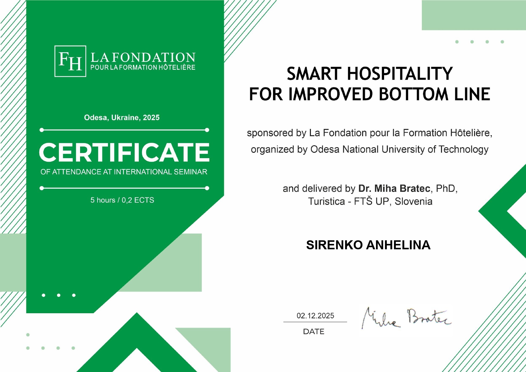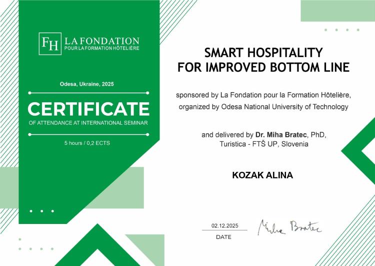 У грудні 2025 року викладачі кафедри готельно-ресторанної справи та туризму долучилися до міжнародного онлайн-вебінару «Smart Hospitality for Improving Hotel Business Efficiency», що відбувався англійською мовою та організований кафедрою готельно-ресторанного бізнесу Одеського національного технологічного університету за підтримки La Fondation pour la Formation Hôtelière (Швейцарія).