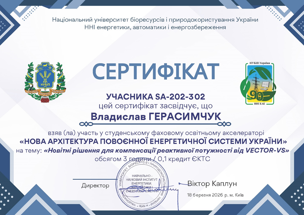Важливо відзначити, що студентський освітній фаховий акселератор є ключовою складовою платформи неформальної освіти ННІ енергетики, автоматики і енергозбереження. Усі зареєстровані учасники мають можливість отримати сертифікати про неформальну освіту (0,25 кредиту ECTS) за тематикою заходу. Такі сертифікати можуть бути враховані під час вивчення профільних дисциплін відповідних освітніх програм і становлять до 25 % навчального навантаження, що зараховується в межах формування індивідуальної освітньої траєкторії студента. Сертифікати видаються в електронній формі та розміщуються на сайті інституту, де їх можна переглянути або пред’явити викладачам у разі потреби.