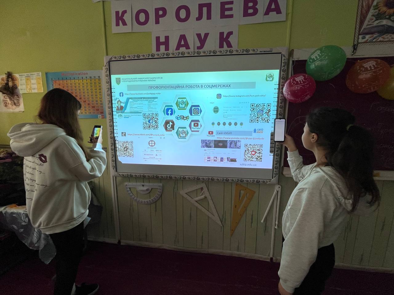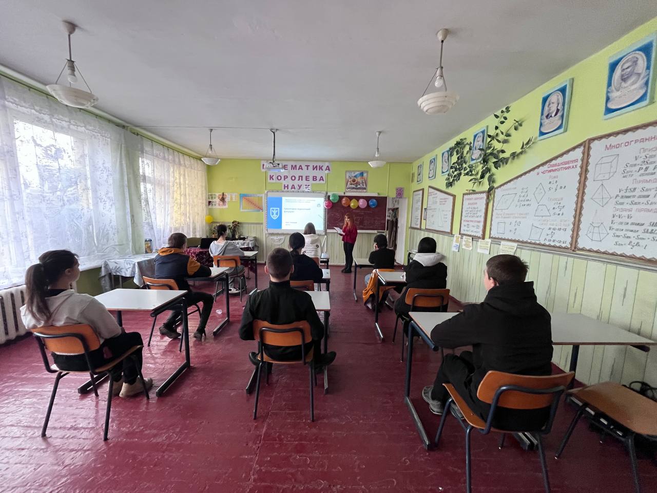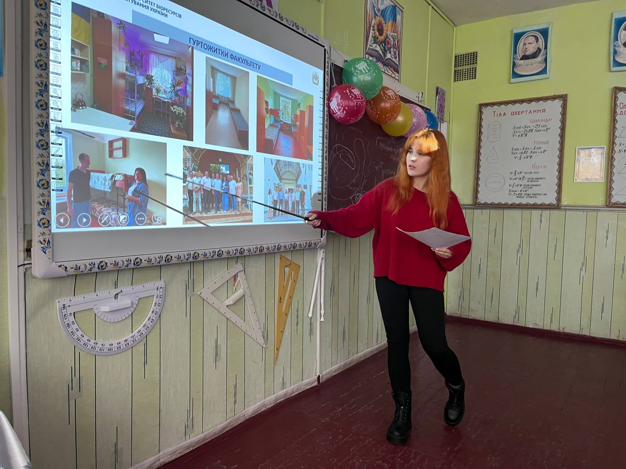Профорієнтаційна бесіда, проведена студенткою 2-го курсу спеціальності «Філологія» гуманітарно-педагогічного факультету Національного університету біоресурсів і природокористування України Катериною СЕРЕБРЯНСЬКОЮ з учнями 10-11 класів Мар’янівського ліцею Виноградської сільської ради Звенигородського району Черкаської області, містила вичерпну інформацію про якісну та доступну вищу освіту, запропоновану НУБіП України, у поєднанні зі змістовною позанавчальною діяльністю, що мають на меті розкриття наукового потенціалу, розвиток професійних навичок та творчих здібностей студентів.