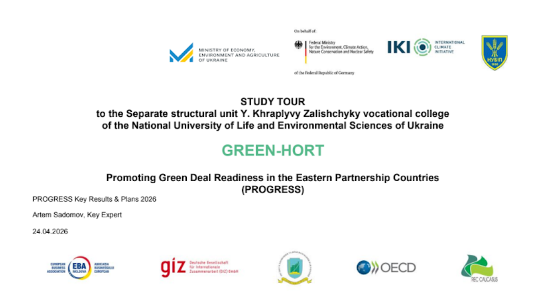 Слід нагадати, що грантова угода GREEN – HORT є складовою реалізації міжнародного проєкту «Підготовка країн Східного партнерства до Європейського зеленого курсу (PROGRESS)», який фінансується Федеральним міністерством захисту довкілля, кліматичних дій, охорони природи та ядерної безпеки Німеччини (BMUKN) в рамках його Міжнародної кліматичної ініціативи (IKI), що реалізується в Україні Консорціумом організацій під керівництвом німецької урядової організації Deutsche Gesellschaft für Internationale Zusammenarbeit (GIZ) GmbH, Організації економічного співробітництва та розвитку (ОЕСР), Державної Установи Інститут економіки та прогнозування Національної Академії Наук України (ІЕП). Також, даний грант є складової міжнародного проєкту «Сприяння впровадженню Зеленої Угоди в країнах Східного партнерства GIZ PROGRESS» за участю країн Східного партнерства (Азербайджан, Вірменія, Грузія, Молдова, Україна).