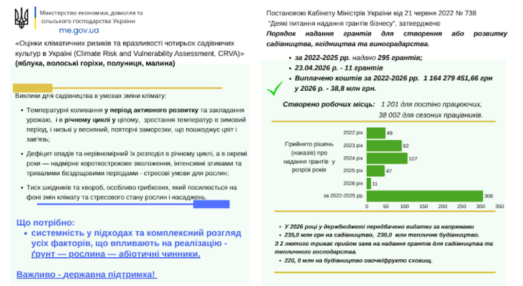 Участь науковців Національного університету біоресурсів і природокористування України в реалізації грантової угоди зосереджена передусім на системному дослідженні впливу кліматичних змін на функціонування та результативність виробництва плодово-ягідної продукції. Особливий акцент зроблено на аналізі адаптаційного потенціалу ключових культур, зокрема яблук, малини, суниці садової та волоського горіха, з урахуванням змін агрокліматичних параметрів, частоти екстремальних погодних явищ і трансформації технологічних підходів до ведення садівництва.