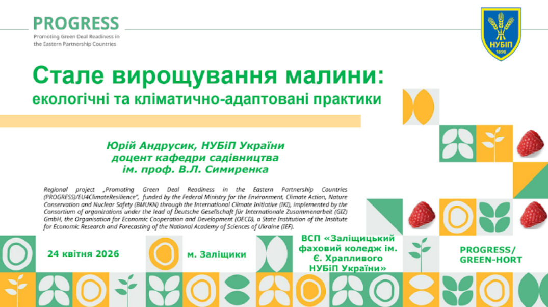 24 квітня 2026 року відбувся Study Tour щодо впровадження кліматично стійких та зелених практик у садівництві, гранту «Передача знань та нарощування потенціалу для державних і приватних місцевих структур підтримки та фермерів для впровадження кліматично стійких і зелених практик у садівництві в Україні» (GREEN – HORT) в рамках реалізації міжнародної проєкту GIZ PROGRESS в Україні. Даний захід проходив у м. Заліщики на базі ВСП «Заліщицький фаховий коледж ім. Є. Храпливого НУБіП України».