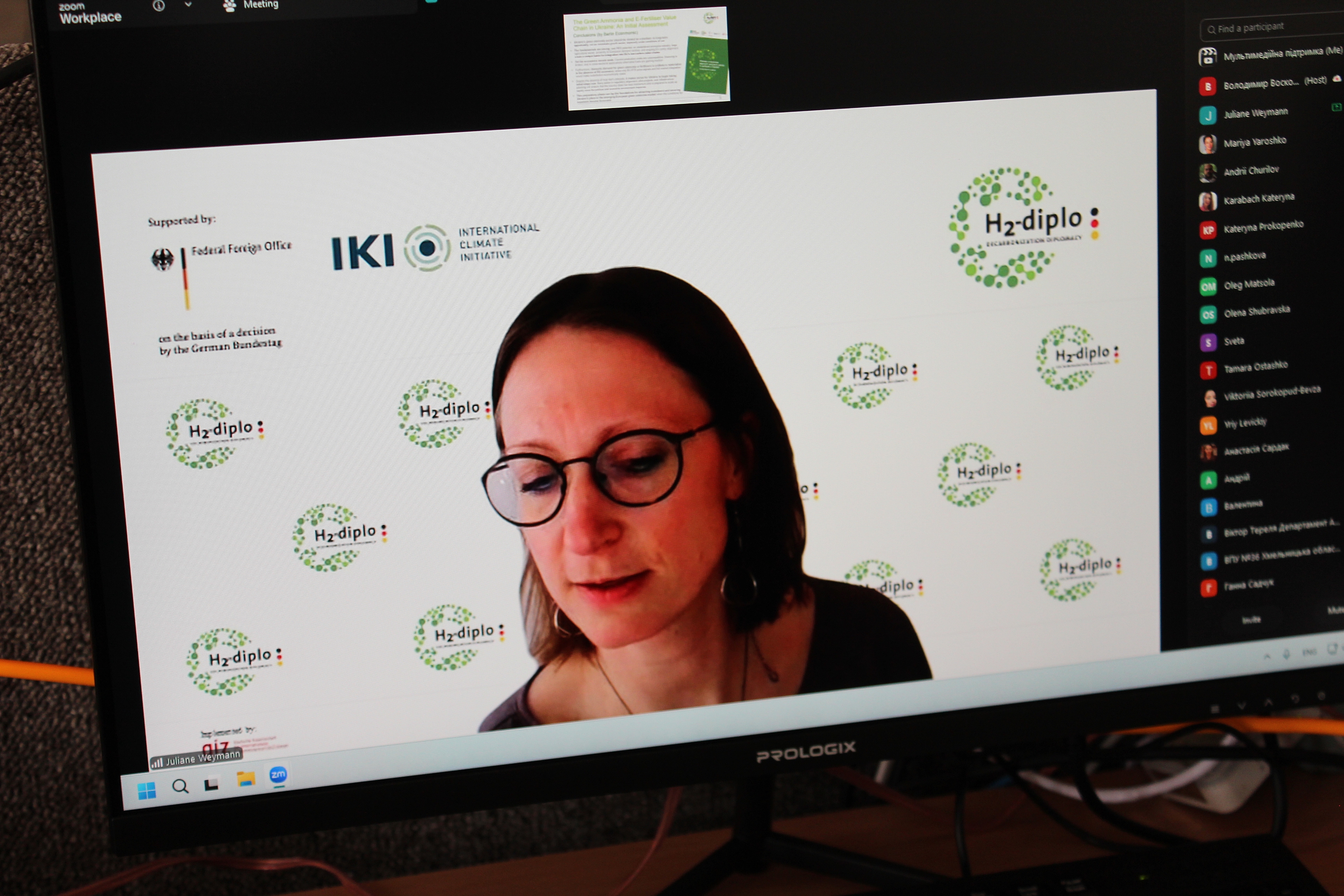Також, висловлюємо щиру вдячність Юліане ВЕЙМАНН — керівниці Офісу H2-diplo у Києві (GIZ) за можливість долучитись онлайн на завершення пленарного обговорення. ЇЇ виступ на тему «Стратегічні можливості виробництва зеленого аміаку та e-добрив для України» був присвячений стратегічним аспектам розвитку інноваційних напрямів агроенергетики: обґрунтовано потенціал використання відновлюваних джерел енергії для виробництва екологічно чистих добрив, що є важливим елементом декарбонізації аграрного сектору.