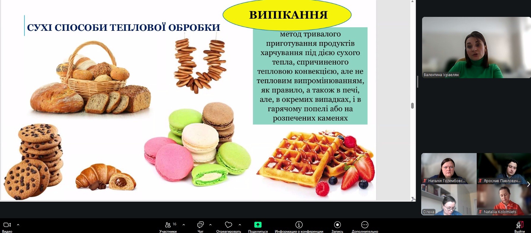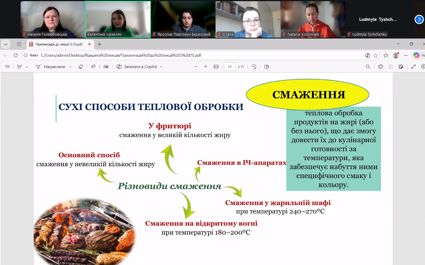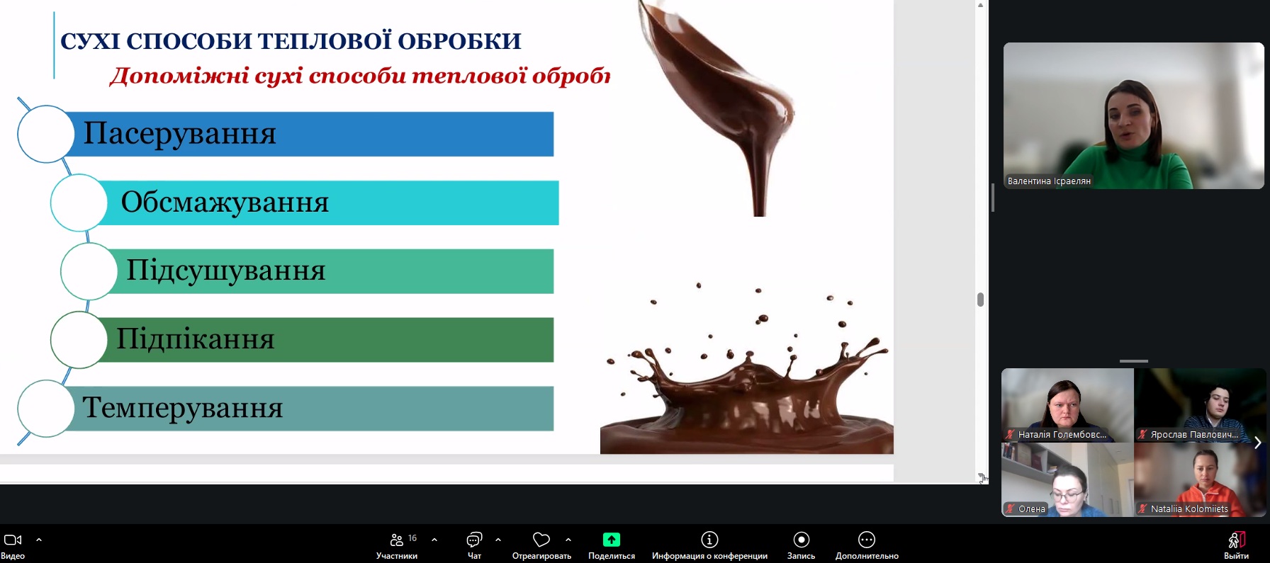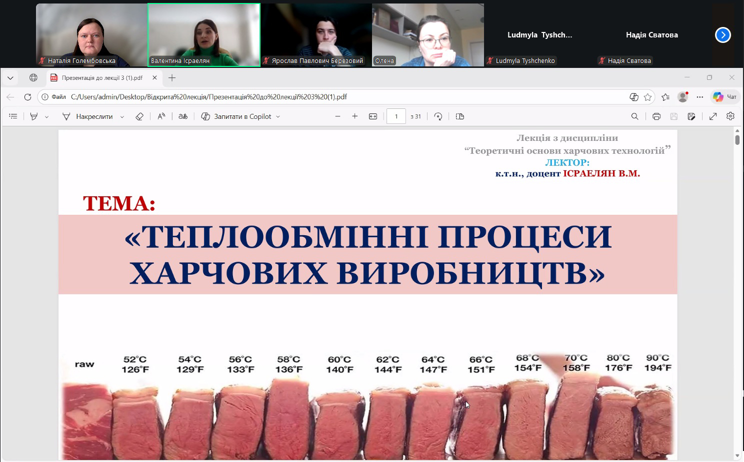 У межах навчального процесу кафедри технології м’ясних, рибних та морепродуктів було проведено відкрите лекційне заняття з дисципліни «Теоретичні основи харчових технологій», присвячене вивченню теплообмінних процесів у харчових виробництвах. Лекцію провела доцент кафедри Валентина ІСРАЕЛЯН. Заняття було організовано з метою поглиблення теоретичних знань здобувачів освіти та формування практичного розуміння процесів термічної обробки харчової сировини.
