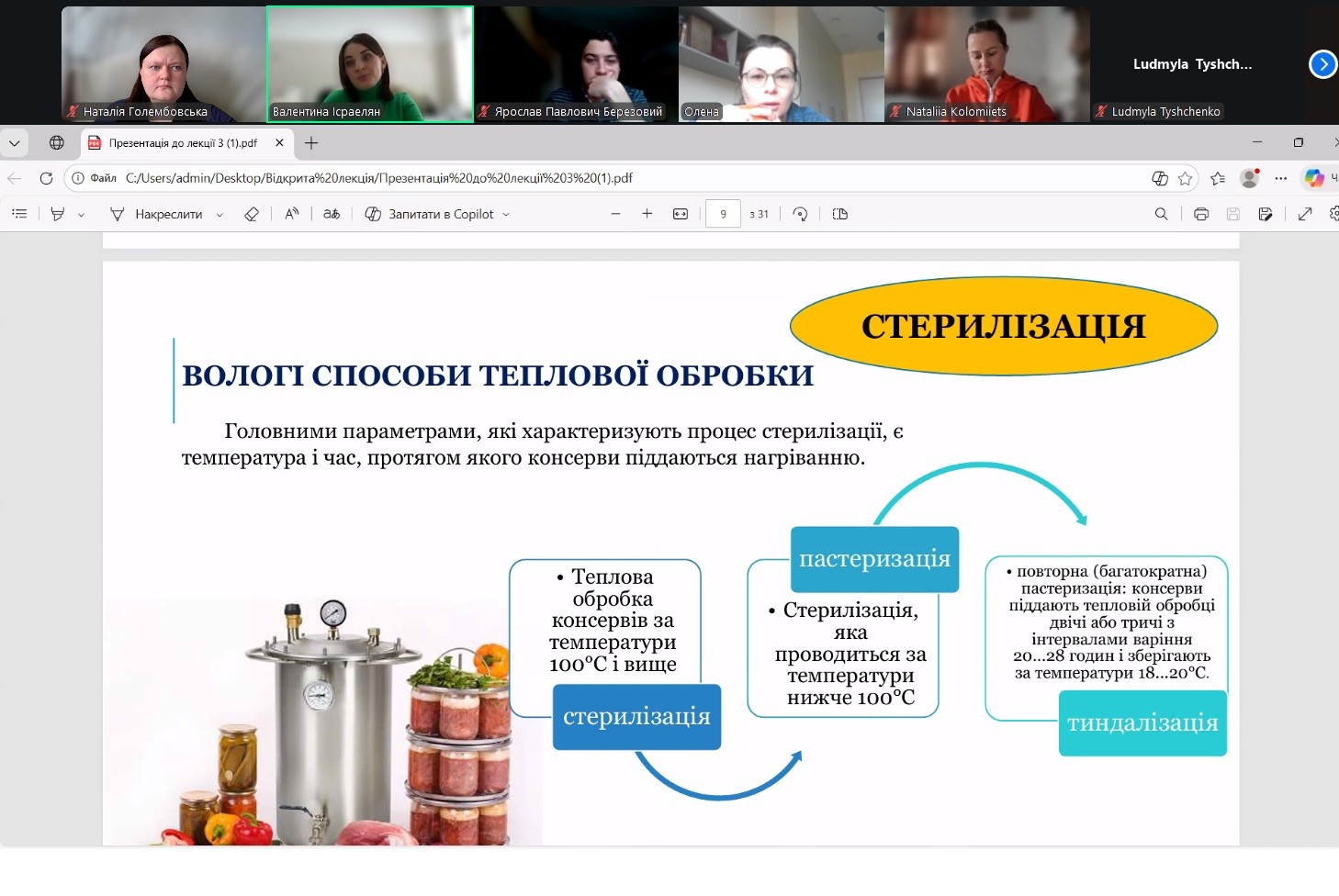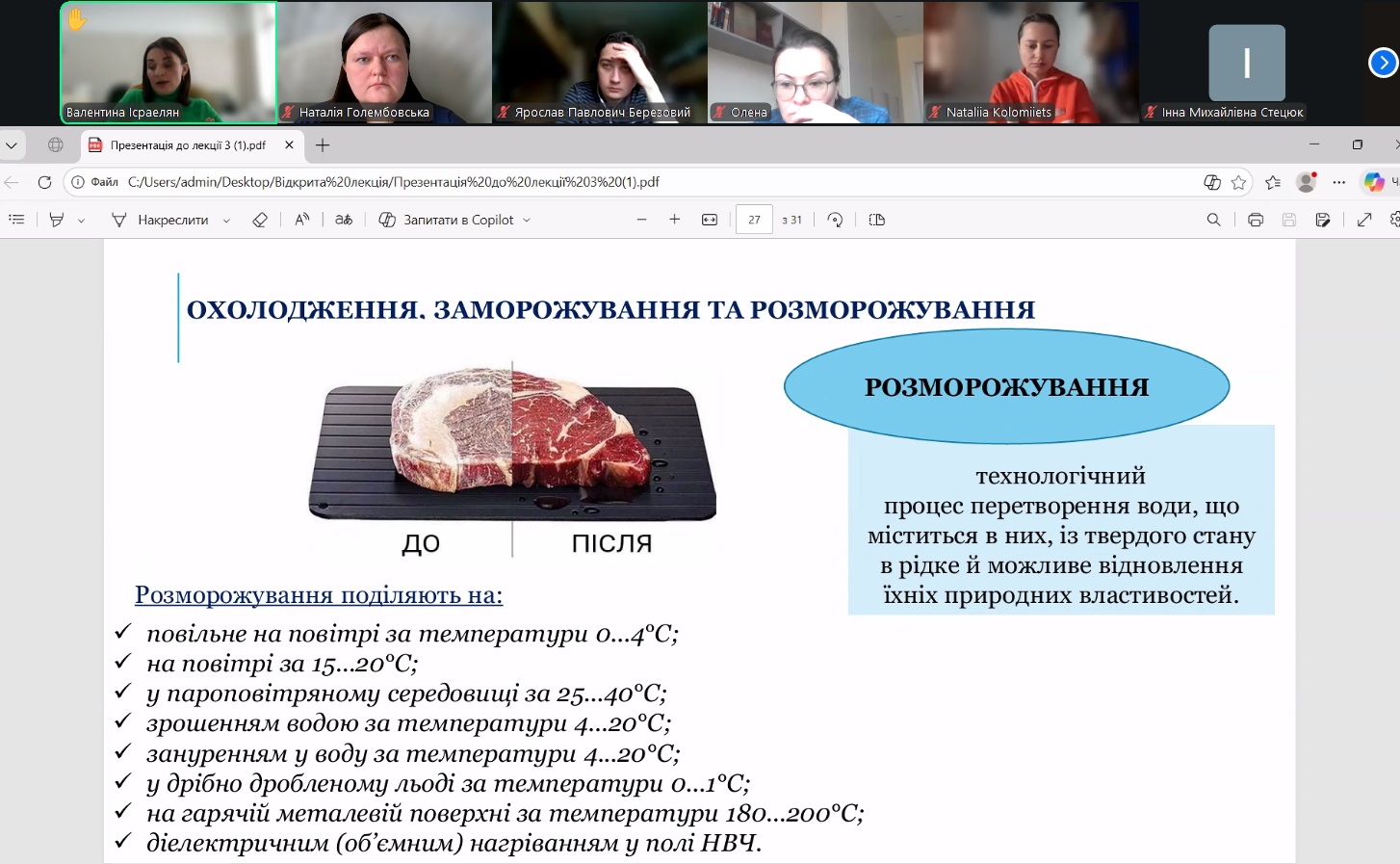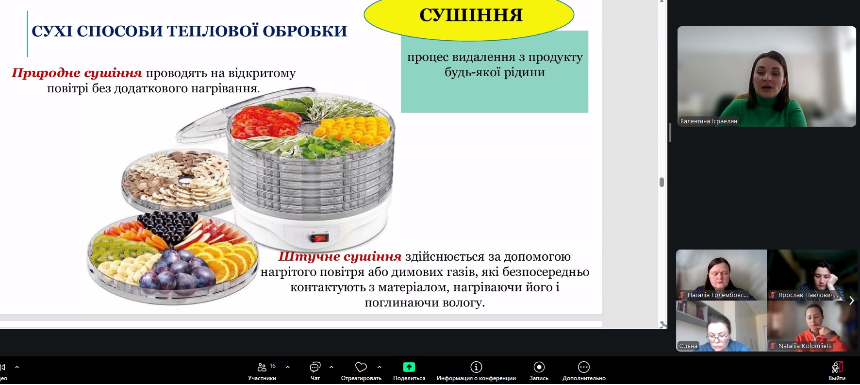 У межах навчального процесу кафедри технології м’ясних, рибних та морепродуктів було проведено відкрите лекційне заняття з дисципліни «Теоретичні основи харчових технологій», присвячене вивченню теплообмінних процесів у харчових виробництвах. Лекцію провела доцент кафедри Валентина ІСРАЕЛЯН. Заняття було організовано з метою поглиблення теоретичних знань здобувачів освіти та формування практичного розуміння процесів термічної обробки харчової сировини.