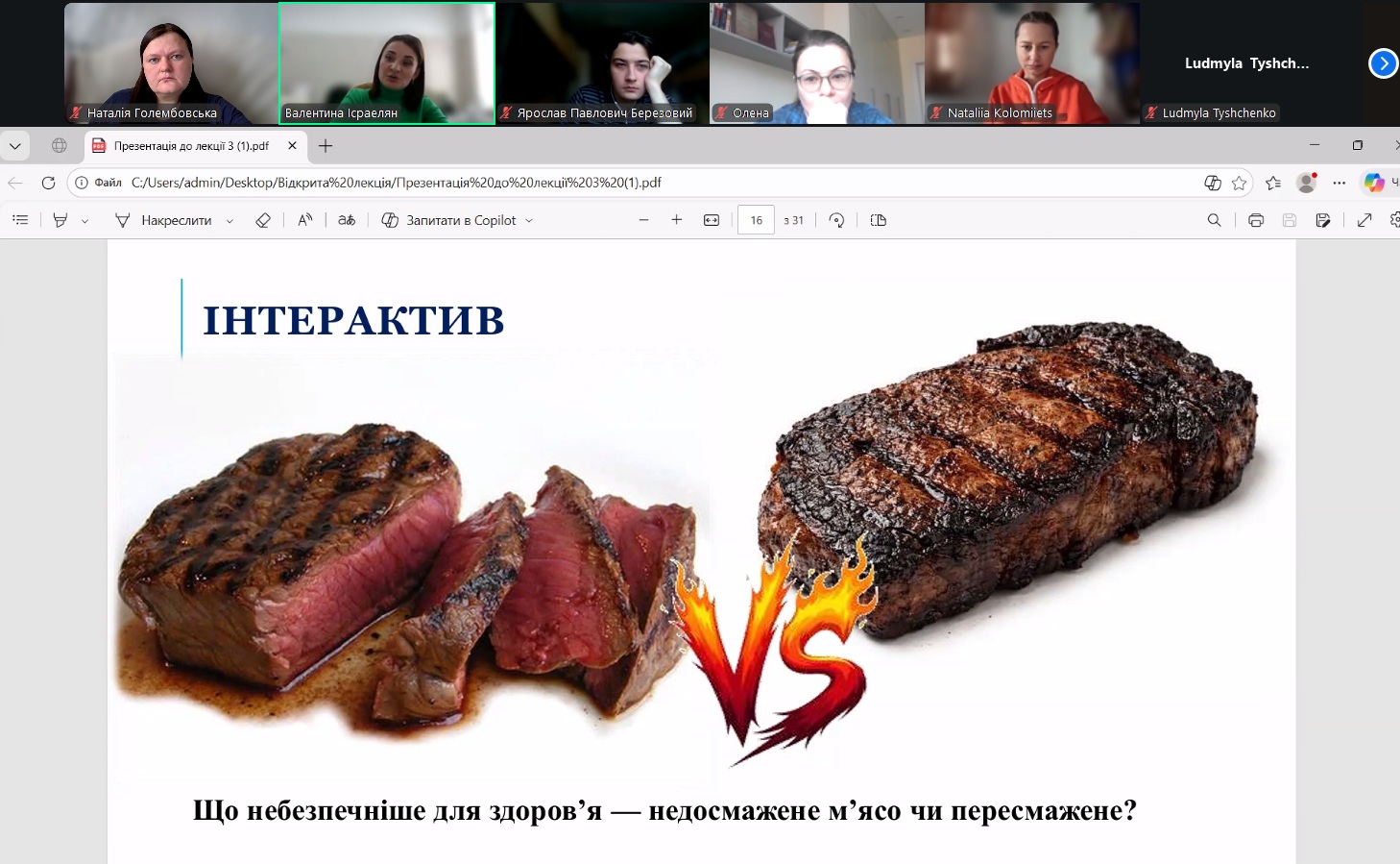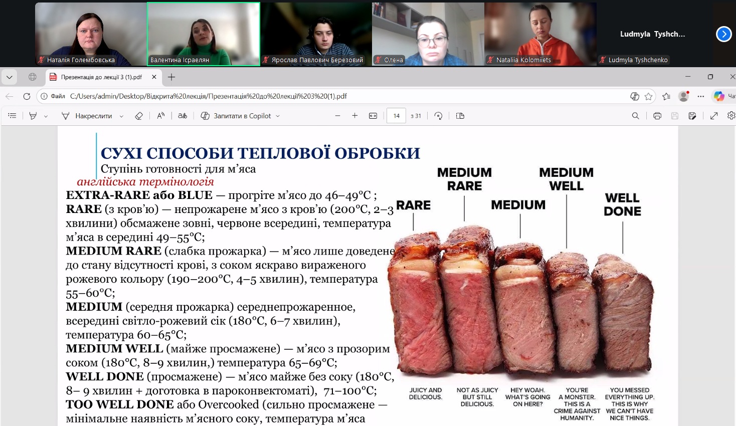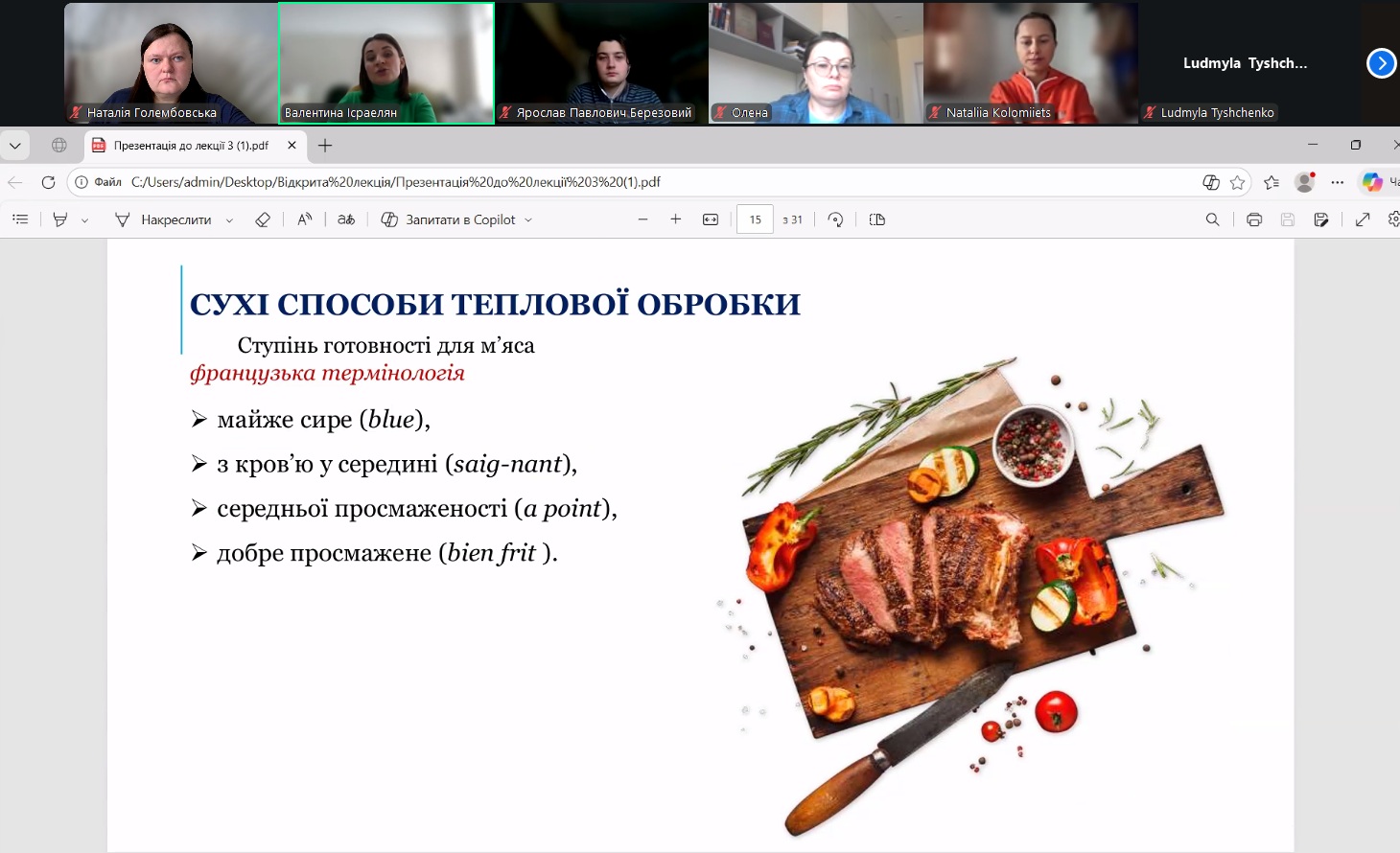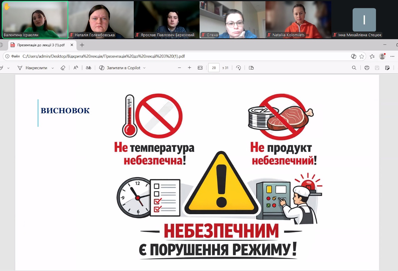 У межах навчального процесу кафедри технології м’ясних, рибних та морепродуктів було проведено відкрите лекційне заняття з дисципліни «Теоретичні основи харчових технологій», присвячене вивченню теплообмінних процесів у харчових виробництвах. Лекцію провела доцент кафедри Валентина ІСРАЕЛЯН. Заняття було організовано з метою поглиблення теоретичних знань здобувачів освіти та формування практичного розуміння процесів термічної обробки харчової сировини.