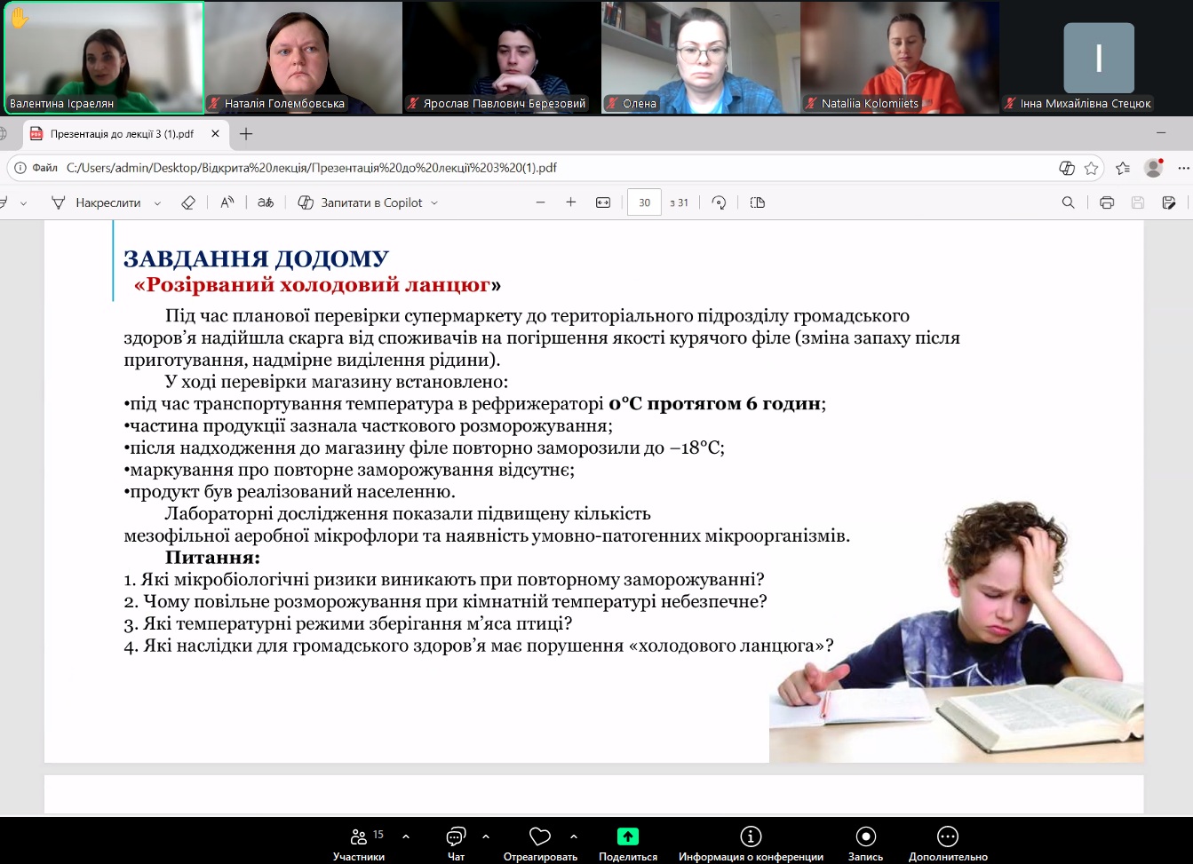 Проведене відкрите лекційне заняття продемонструвало високий науково-методичний рівень викладання та актуальність тематики для підготовки фахівців у галузі харчових технологій та громадського здоров’я. Використання інтерактивних елементів і розгляд практичних ситуацій підвищили ефективність засвоєння матеріалу та сприяли активному залученню студентів до освітнього процесу.