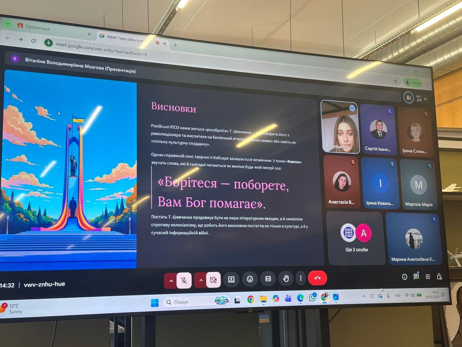 Їхні наукові пошуки було спроєктовано на сучасність, на переосмислення та реактуалізацію постаті Тараса ШЕВЧЕНКА в контексті тираноборчих інтенцій сьогодення! Особливий інтерес й обговорення викликали доповіді Катерини ЄВЛАН і Віталіни МОЗГОВОЇ на тему «Постать Тараса Шевченка в системі ворожих ІПСО: аналіз маніпуляцій у масмедіа» і Анастасії МАРТОШЕНКО на тему «Якби Т. Шевченко вів блог: аналіз "Журналу" (щоденника) як прототипу сучасного автофікшн-блогу». Авторки аргументовано відповідали на питання щодо мови написання Шевченкового щоденника, ворожих маніпуляцій фактами з біографії та віршами видатного поета.