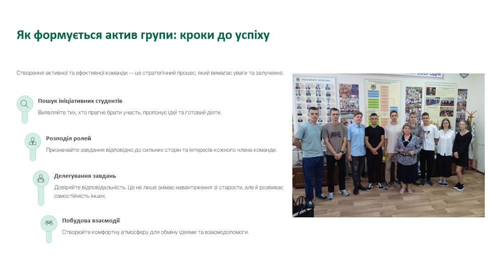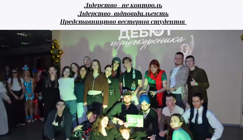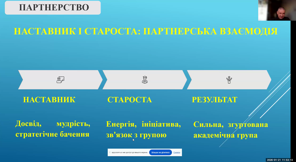 Під час заходу було обговорено практичні підходи до формування лідерських якостей у студентів, зокрема майбутніх інженерів, через участь у студентському самоврядуванні, роботу академічних груп, організацію студентського дозвілля та наставницьку підтримку.