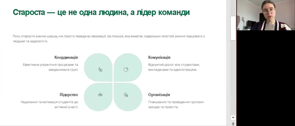 Марія ПАНЧЕНКО, староста академічної групи ЕЕЕ-24001б, поділилася практичним досвідом формування активу академічної групи та побудови командної роботи через делегування повноважень і спільну відповідальність;