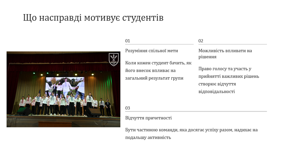 Юрій КОПИЛОВ, староста групи АКІТ-25002б, зосередив увагу на питаннях мотивації та взаємодії в академічній групі як ключових чинниках залучення студентів до спільної діяльності;