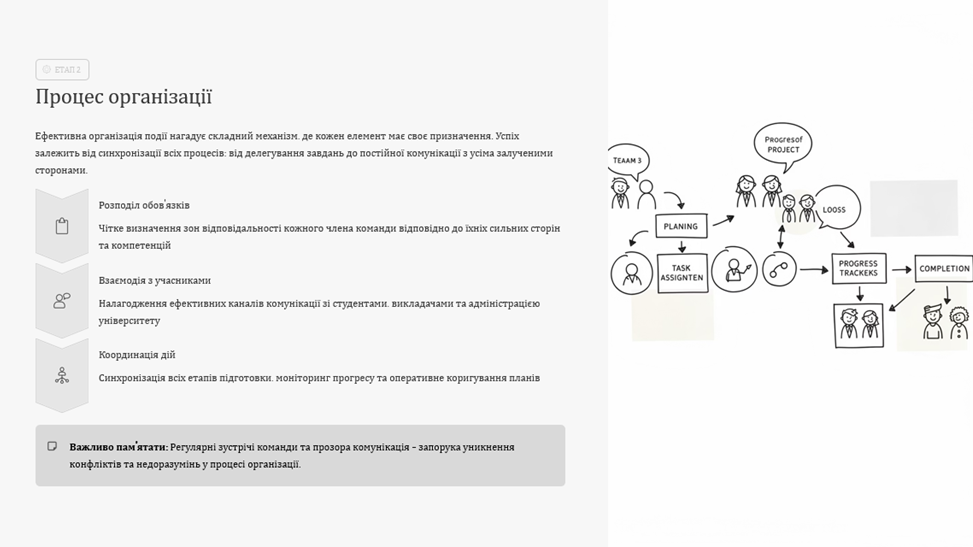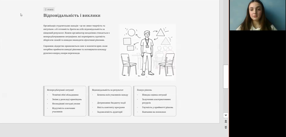 Продовжуючи тему студентських ініціатив, Роксолана ЛАЗІВСЬКА, голова медійного сектору та студентка групи ЕЕЕ-24001б, розповіла про шлях від ідеї до реалізації студентського заходу як важливий досвід формування відповідальності та лідерських якостей студента.