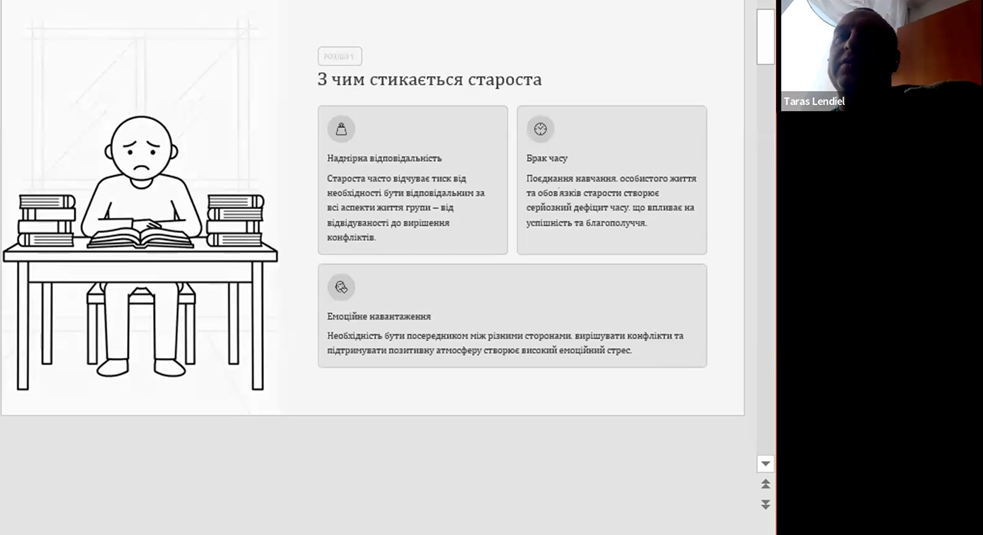 Завершив серію виступів Тарас ЛЕНДЄЛ, наставник академічної групи АКІТ-22001б, який наголосив на важливості партнерської взаємодії наставника зі старостою з метою ефективної підтримки студентів без надмірного перевантаження.