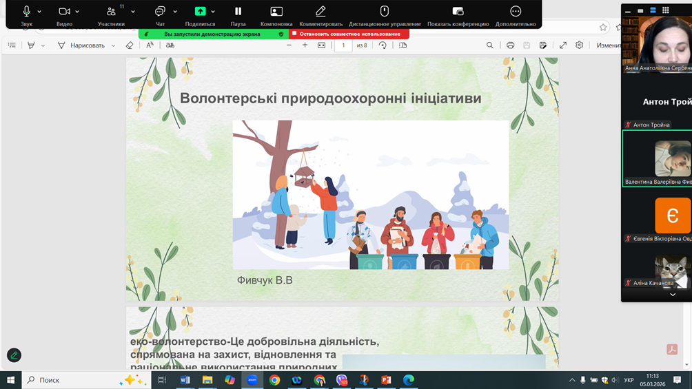 Студентка Валентина Фивчук представила доповідь на тему «Волонтерські природоохоронні ініціативи». У своєму виступі вона розповіла про роль волонтерського руху у збереженні природи, участь громадськості у природоохоронних акціях, екологічних проєктах та заходах із відновлення природних екосистем. Доповідачка наголосила на важливості залучення молоді до волонтерської діяльності, спрямованої на охорону довкілля та формування екологічної свідомості суспільства.