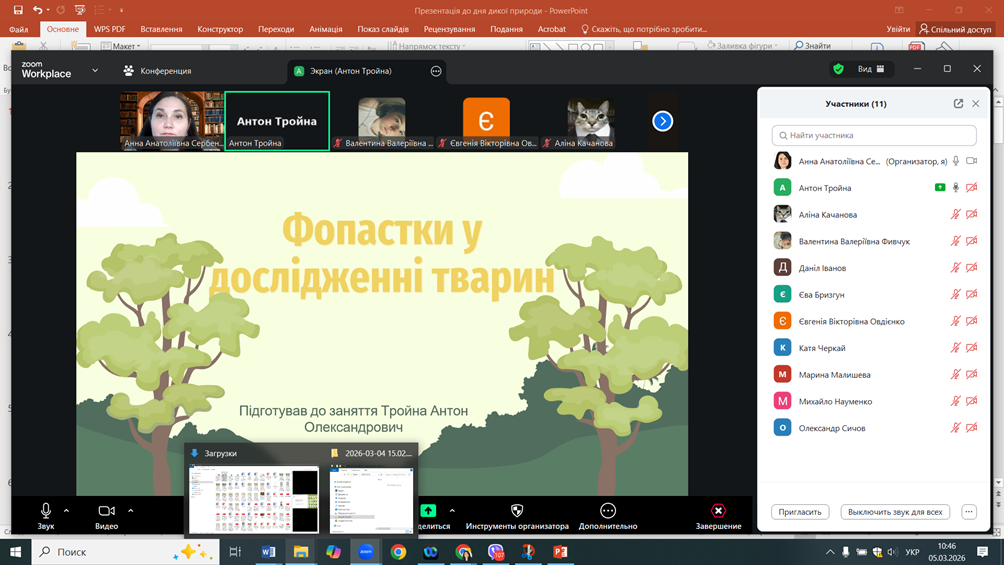 Студент Антон Тройна представив доповідь на тему «Фотопастки у дослідженні тварин», у якій висвітлив можливості використання автоматичних камер для спостереження за дикою фауною. Доповідач розповів про принцип роботи фотопасток, їх значення у вивченні поведінки тварин, моніторингу популяцій та фіксації рідкісних видів у природному середовищі. Особливу увагу було приділено використанню фотопасток у природоохоронних дослідженнях та на територіях природно-заповідного фонду.