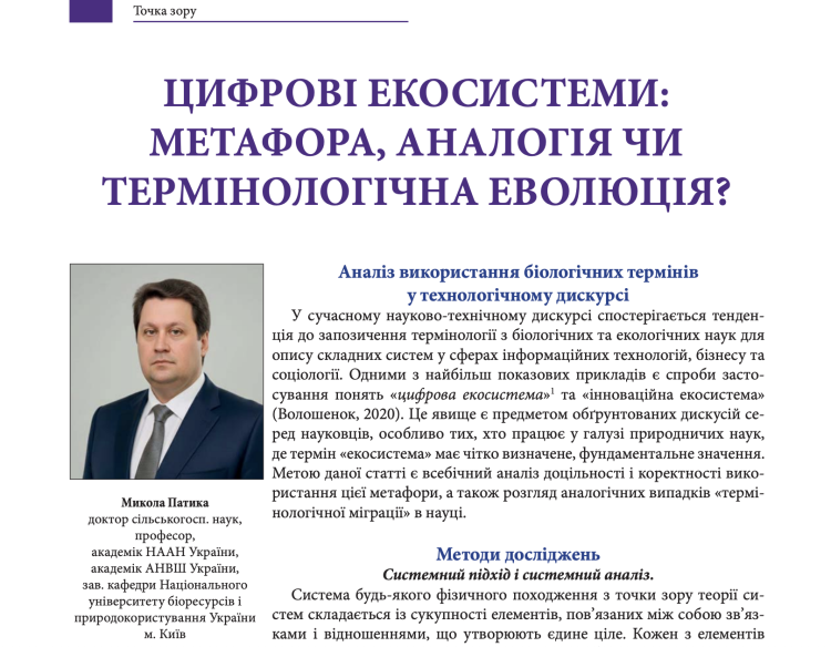Останнім часом увага до екологічної проблематики і термінології суттєво зросла в різних галузях знань, зокрема в технічних, соціальних, економічних і гуманітарних науках. Навіть в системі освіти та інформаційних технологіях (Гріненко О. О. 2014) формується спеціальна екологічна терміносфера «у вигляді маргінальних термінів» (Рудишин С.Д., 2023). При цьому спостерігається тенденція до запозичення термінології з біологічних та екологічних наук для опису складних систем у сферах інформаційних технологій, бізнесу та соціології. Одними з найбільш показових прикладів є спроби застосування понять «лінгвоекологія» та «екологія мови» (Цвид-Гром О. П., Зелінська В. А., 2025), «цифрова екосистема» та «інноваційна екосистема» (Волошенок, 2020) тощо. Це явище є предметом обґрунтованих дискусій серед науковців, особливо тих, хто працює у галузі природничих наук, де термін «екосистема» має чітко визначене, фундаментальне значення. Метою нашого дослідження був всебічний аналіз доцільності і коректності використання цієї метафори, а також розгляд аналогічних випадків «термінологічної міграції» в науці.
