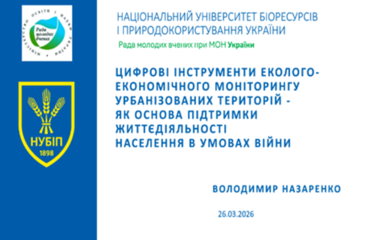 Серед спікерів пленарного засідання — Володимир Назаренко, докторант кафедри землевпорядного проєктування, член Ради молодих вчених при Міністерстві освіти і науки України. Він представив доповідь на тему «Цифрові інструменти еколого-економічного моніторингу урбанізованих територій як основа підтримки життєдіяльності населення в умовах війни».
