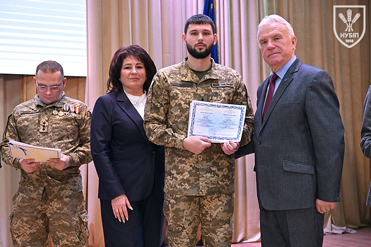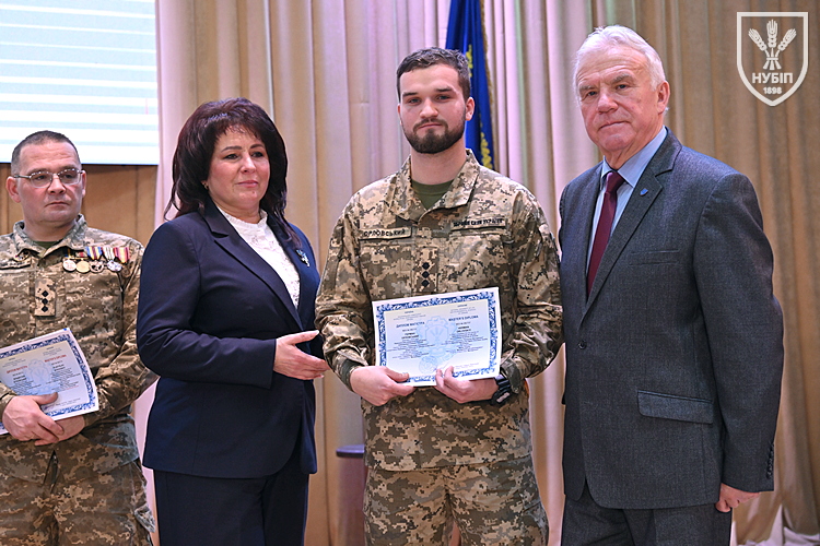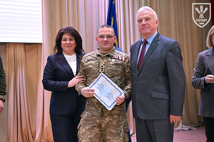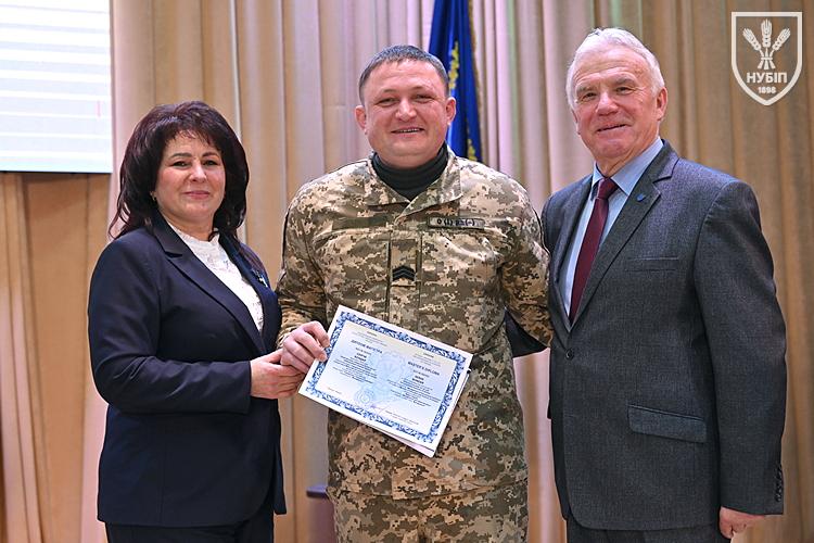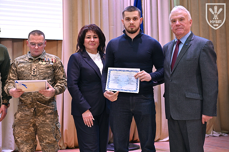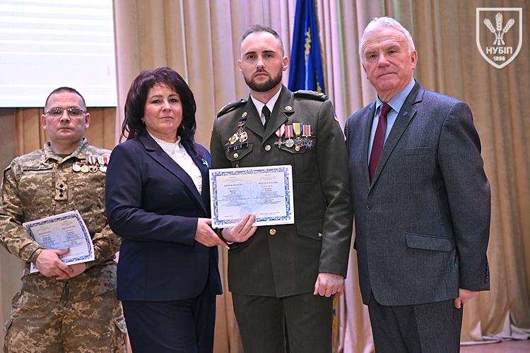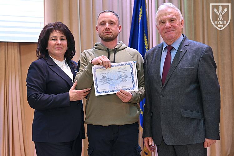 Десятеро доблесних захисників, які знайшли можливість особисто приїхати на урочисту подію вручення. Дипломи захисникам вручили президент університету Станіслав Ніколаєнко та декан факультету Інна Савицька. Зокрема, отримала диплом дружина випускника Юрія Мушляка, який наразі перебуває на фронті - Ірина.