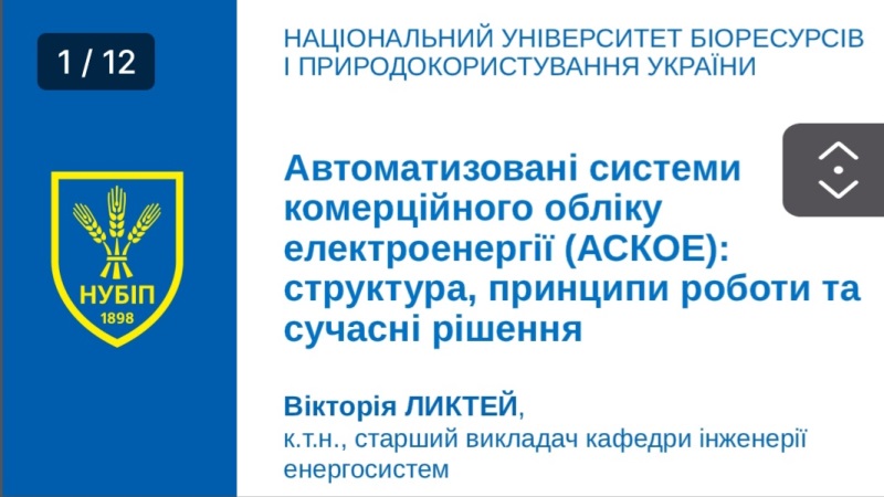 25 березня викладачка циклової комісії спеціальних електротехнічних дисциплін Оксана ДУДАР провела бінарну лекцію спільно з кандидаткою технічних наук, старшою викладачкою кафедри інженерії енергосистем ННІ енергетики, автоматики і енергозбереження Національного університету біоресурсів і природокористування України Вікторією ЛИКТЕЙ. Тема заняття: «Автоматизовані системи комерційного обліку електроенергії (АСКОЕ): структура, принципи роботи та сучасні рішення».