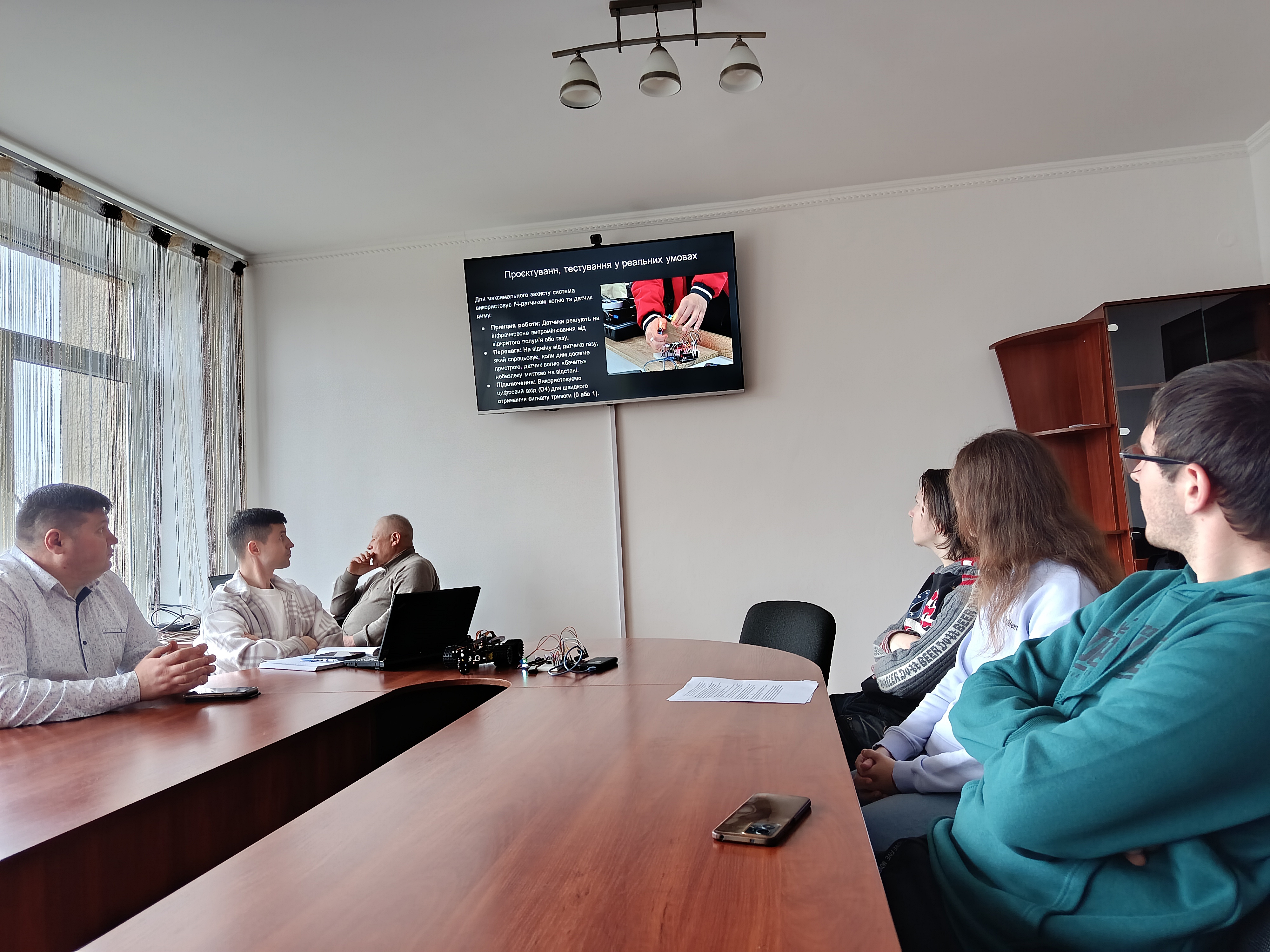 Студентка 41 групи Надія ЛЮДКЕВИЧ презентувала тему «Розробка інтелектуальної роботизованої платформи на базі Raspberry Pi 5 для переходу від ручного до автономного керування». Керівник дипломного проєкту — Михайло ПРОНЬ.