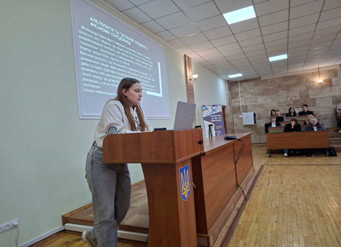 У рамках конкурсу студентка 3 курсу 5 групи ФВМ Ігнатенко Софія – член студентського наукового гуртка «Мікробіологія продуктів тваринництва» кафедри ветеринарної епідеміології та охорони здоров’я тварин, виступила з доповіддю і гідно представила свої наукові дослідження за темою: «Фітонциди – їх вплив на мікроорганізми».
