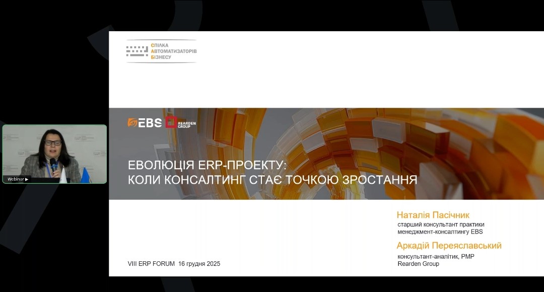 З доповіддю «Еволюція ERP-проекту: коли консалтинг стає точкою зростання» виступили Наталія ПАСІЧНИК, старший консультант практики менеджмент-консалтингу компанії EBS та Аркадій ПЕРЕЯСЛАВСЬКИЙ, консультант-аналітик компанії Rearden Group, які розкрили значення консалтингового супроводу ERP-проєктів як інструменту трансформації бізнес-процесів.