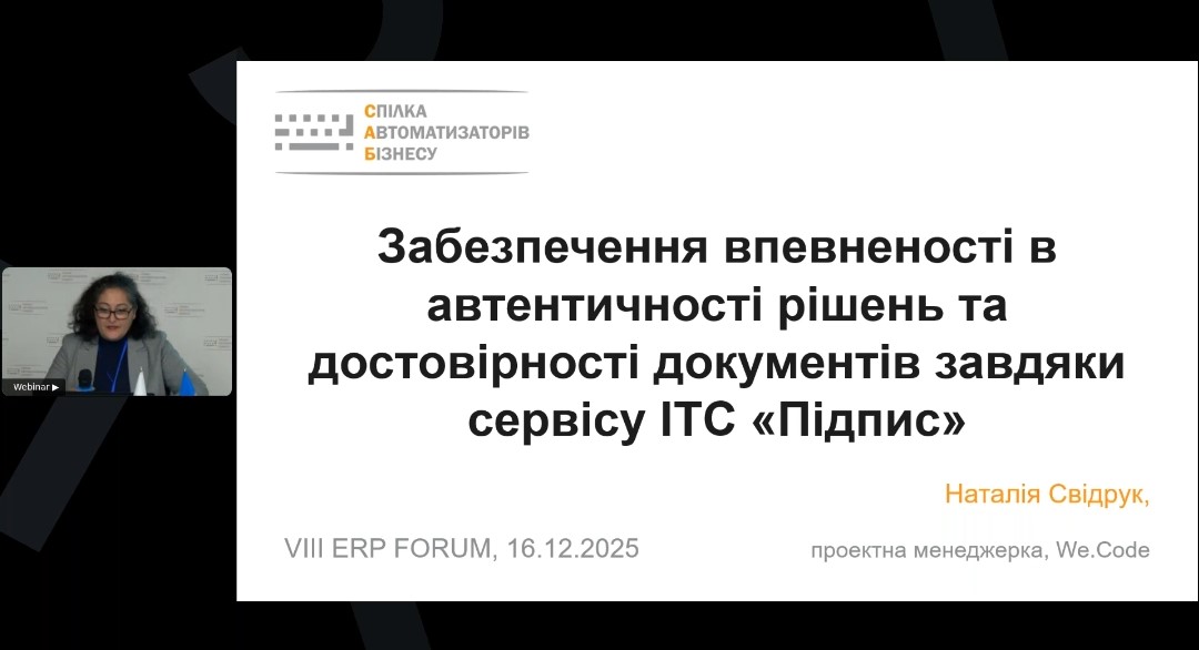 Питання цифрової довіри та юридичної значущості електронних документів було висвітлено Наталією СВІДРУК, проєктною менеджеркою компанії We.Code, у доповіді «Забезпечення впевненості в автентичності рішень та достовірності документів завдяки сервісу ІТС “Підпис”».