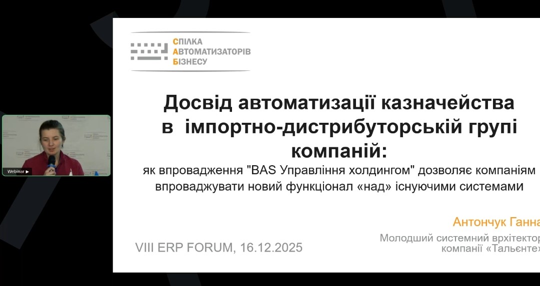 Кейс автоматизації казначейства презентувала Ганна АНТОНЧУК, системна архітекторка компанії «Тальєнте», на прикладі використання інструментів «BAS Управління холдингом» в імпортно-дистриб’юторській групі компаній.