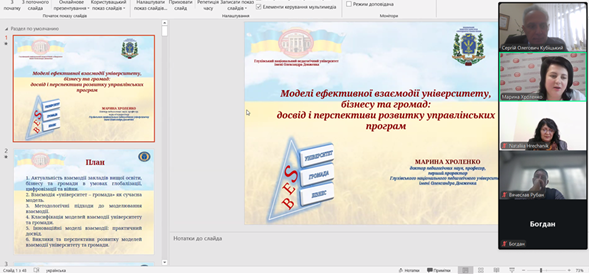 2 квітня 2026 року на кафедрі управління та освітніх технологій гуманітарно-педагогічного факультету відбулася гостьова лекція доктора педагогічних наук, професора, першого проректора Глухівського національного педагогічного університету імені Олександра Довженка Марини Володимирівни Хроленко на тему «Моделі ефективної взаємодії університету, бізнесу та громад: досвід і перспективи розвитку управлінських програм».