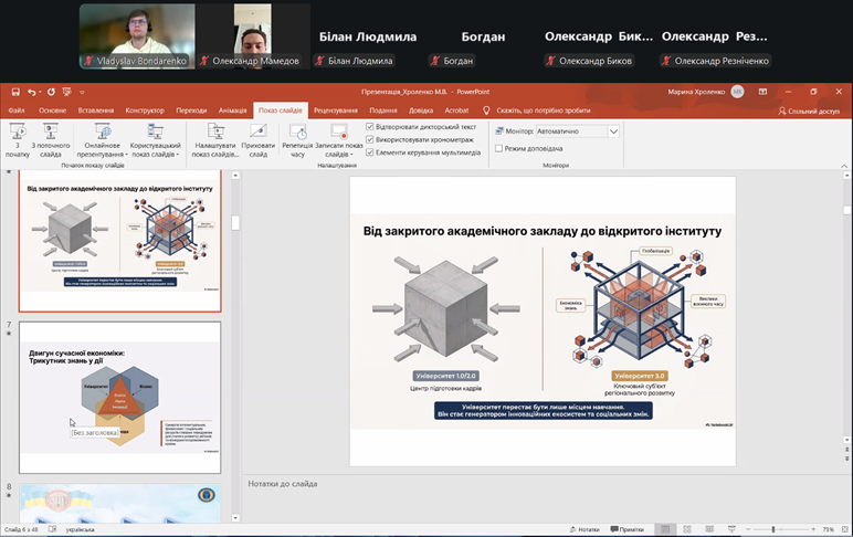 У своєму виступі Марина Володимирівна переконливо продемонструвала, що сучасний університет трансформується у відкриту інституцію, яка активно взаємодіє з бізнесом і громадами, формуючи нову якість освітнього процесу та забезпечуючи розвиток регіонів. Особливий акцент було зроблено на формуванні партнерських екосистем та реалізації моделі «освіта – наука – інновації», що визначає стратегічні орієнтири розвитку управлінських програм.