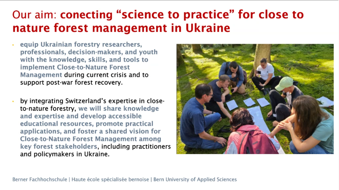 Метою проєкту є зміцнення лісового господарства України шляхом вивчення, навчання та впровадження підходів наближеного до природи лісівництва, що поєднує наукові знання, міжнародний досвід та практичні інструменти для підвищення стійкості лісів до наслідків війни та змін клімату. В межах проекту передбачено обмін досвідом із швейцарськими фахівцями, створення доступних освітніх ресурсів, зокрема онлайн-курсів і практичних посібників, закладання демонстраційних ділянок (мартелоскопів) та інтеграції інформації в цифрові платформи для навчання й моніторингу. Проєкт також спрямовано на формування національної мережі з наближеного до природи лісівництва шляхом об’єднання науковців, практиків і політиків задля відновлення та довгострокової стійкості лісів України.