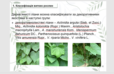 Лекція була проведена на високому навчально-методичному рівні із застосуванням мультимедійних технологій, структурована за планом, влучно ілюстрована авторськими фото, рисунками та графічними матеріалами, таблицями, схемами. В ході лекції подані методичні та практичні рекомендації щодо застосування витких рослин як альтернативного методу озеленення в сучасних населених пунктах.