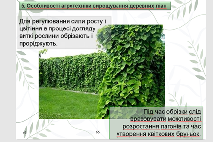 Детально розглянуто класифікацію витких рослин за їхніми біологічними особливостями. Подано розбір типів посадок та сучасних прийомів вертикального озеленення. Розглянуті опорні конструкції, необхідні для розвитку ліан. Також проаналізовані секрети агротехніки вирощування деревних ліан, які забезпечують довговічність зелених насаджень.