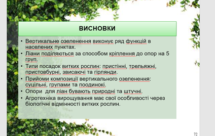 На завершення було зроблено висновки щодо перспектив та обмежуючих факторів вертикального озеленення у населених пунктах.