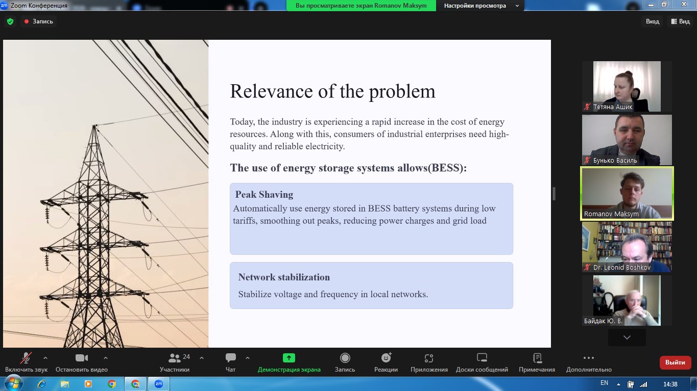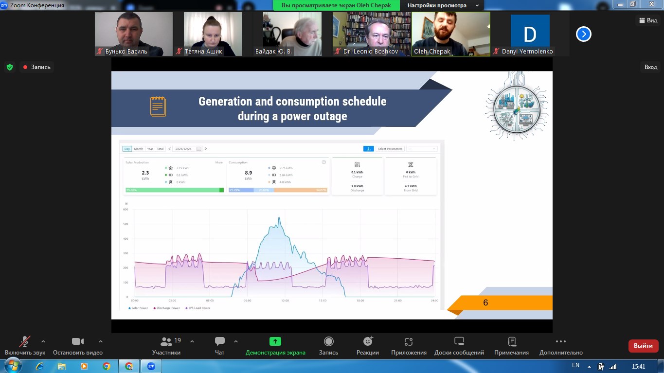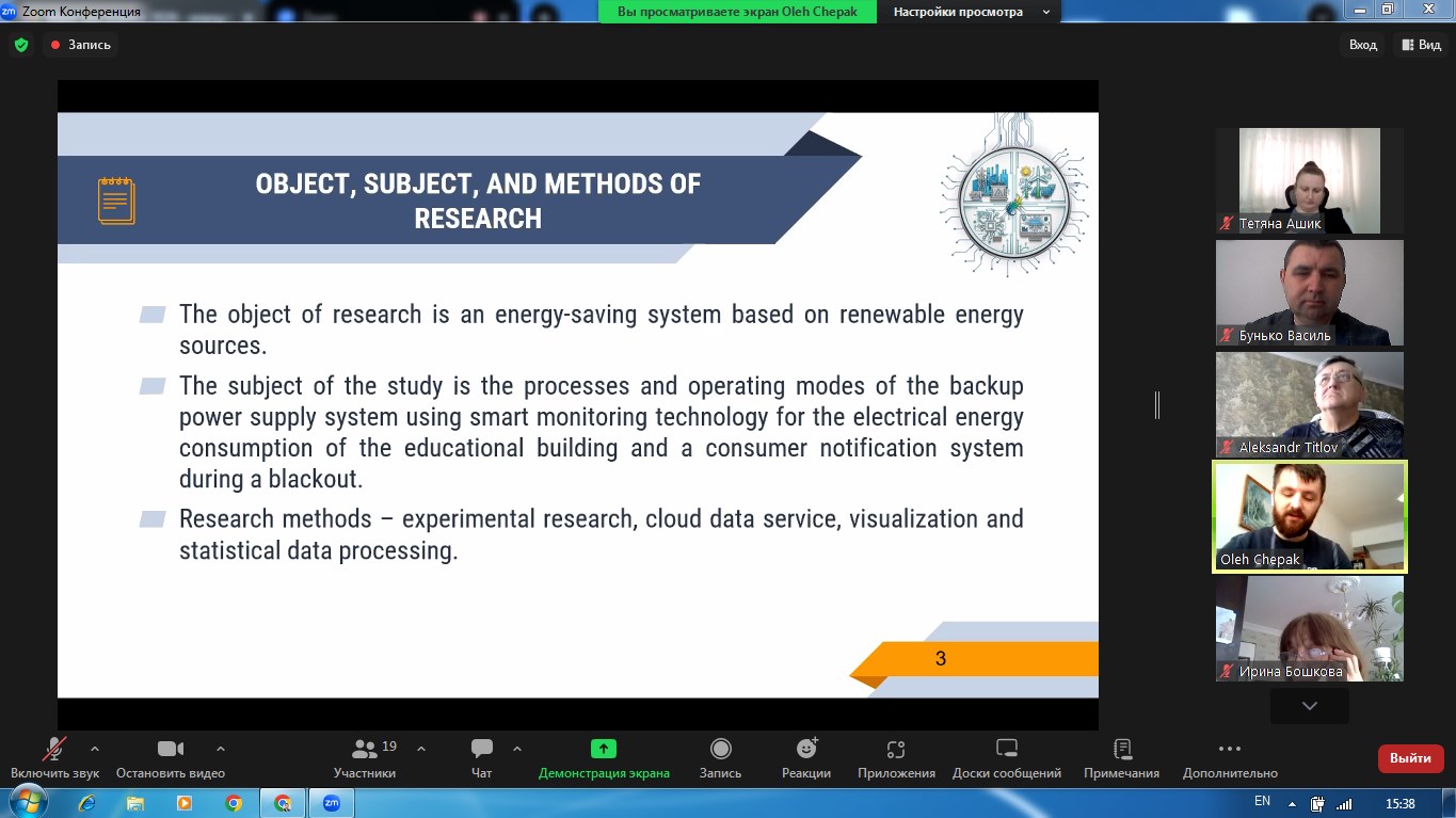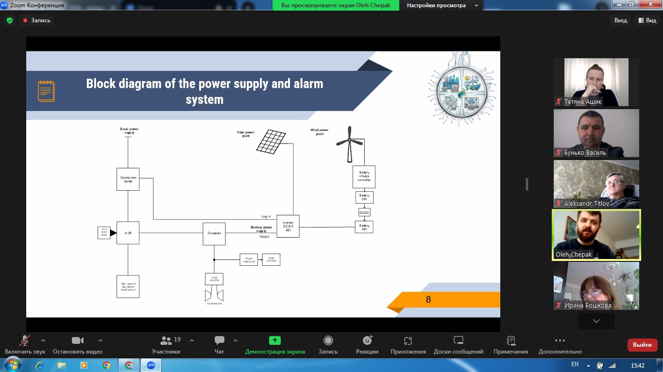 Наша команда представляла наукову роботу на тему «Енергоощадна система резервного живлення навчального корпусу з використанням Smart-моніторингу електроенергії та оповіщення споживачів під час блекауту», яка за результатами відбіркового етапу була включена до числа найкращих — серед 58 поданих робіт та рекомендована до участі у ІІ етапі конкурсу.