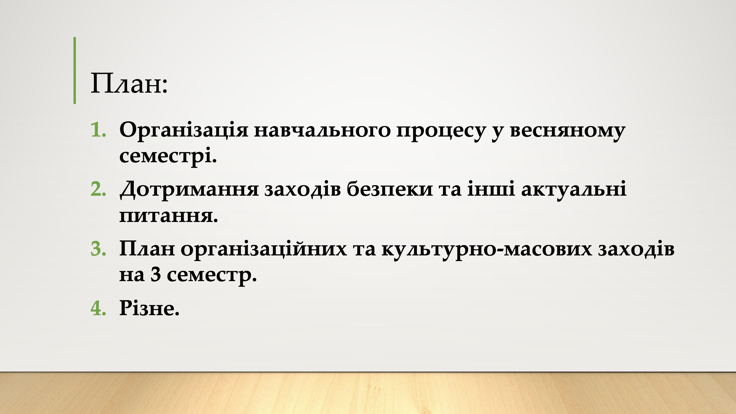 31 січня 2026 р., напередодні весняного семестру, була проведена (онлайн) організаційна година зі студентами 8 групи 2 курсу скороченого терміну навчання.