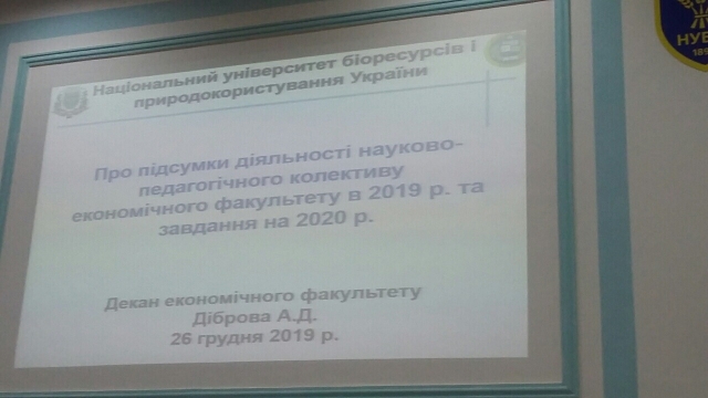 26 грудня 2019 року на економічному факультеті відбулися збори трудового колективу. Представником ректорату на зборах був начальник юридичного відділу Бова А.П. Декан факультету, д.е.н., професор Діброва А.Д. доповів про підсумки діяльності науково-педагогічного колективу економічного факультету в 2019 р. та завдання на 2020 р. Потому слово було надано представникам НПП і студентства, серед яких була й завідуюча кафедри економіки підприємства ім. проф. І.Н. Романенка д.е.н., професор Рогач С.М. У своєму виступі вона підбила підсумки року, зупинилася на проблемах, із якими стикається колектив кафедри в процесі своєї діяльності та окреслила майбутні перспективи кафедри.