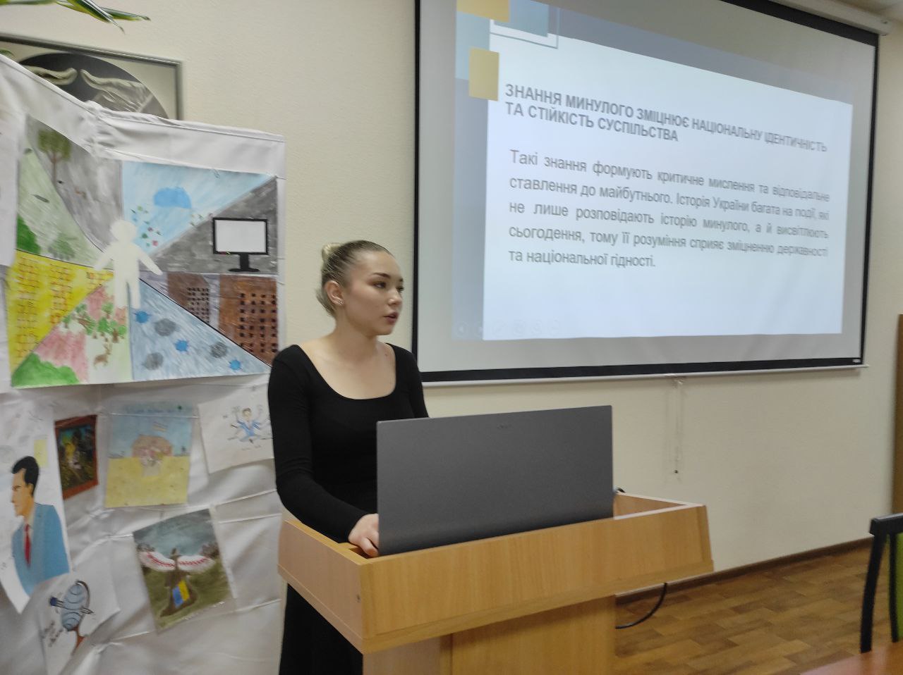 ЗЕЛІНСЬКА Анастасія, студентка 1 курсу гуманітарно-педагогічного факультету спеціальності «Філологія», виступила з доповіддю «Історична пам’ять як основа національної ідентичності в Україні». Студентка наголосила на важливості збереження культурного спадку та колективної пам’яті як чинника об’єднання суспільства в умовах сучасних викликів.