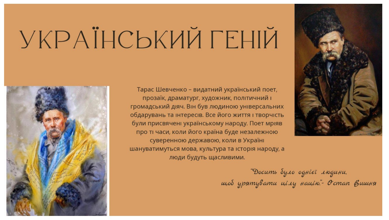 КРИТОВИЧ Дар'я, студентка 1 курсу гуманітарно-педагогічного факультету спеціальності «Міжнародні відносини», представила доповідь «Тарас Шевченко як символ української ідентичності». У виступі вона продемонструвала, як творчість та громадянська позиція Шевченка вплинули на становлення культурної пам’яті українців, акцентувавши увагу на його ролі як морального та духовного орієнтира нації.