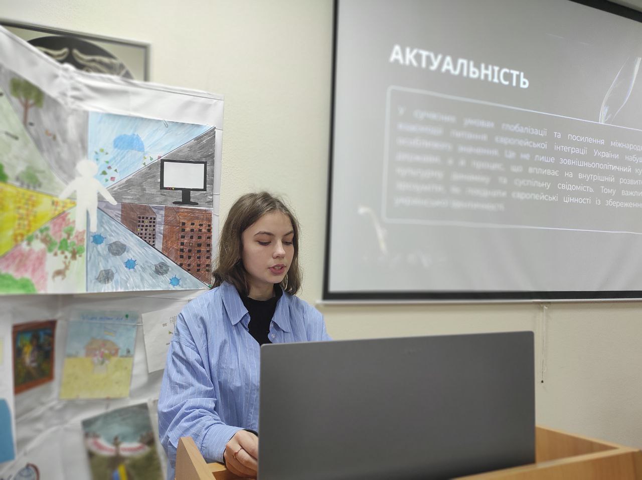 ГУБАРИК Євгенія, студентка 1 курсу гуманітарно-педагогічного факультету спеціальності «Філологія», виголосила доповідь «Європейська ідентичність України: виклики та перспективи інтеграції». Вона розкрила особливості європейського вектора розвитку України та окреслила ключові бар’єри, які супроводжують процес інтеграції у сучасних умовах.