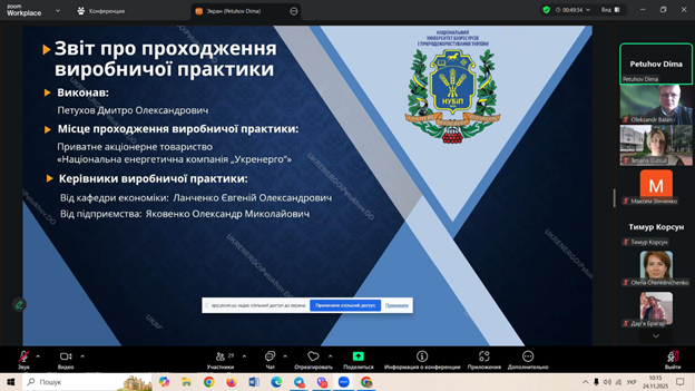 Відповідно до календарного плану-графіку, затвердженого деканом економічного факультету Андрієм МУЗИЧЕНКОМ, 24 листопада 2025 року на кафедрі економіки у форматі онлайн-конференції на платформі ZOOM відбувся захист звітів про проходження виробничої практики здобувачами ОС «Магістр» спеціальності 051 «Економіка» ОПП «Економіка підприємства».