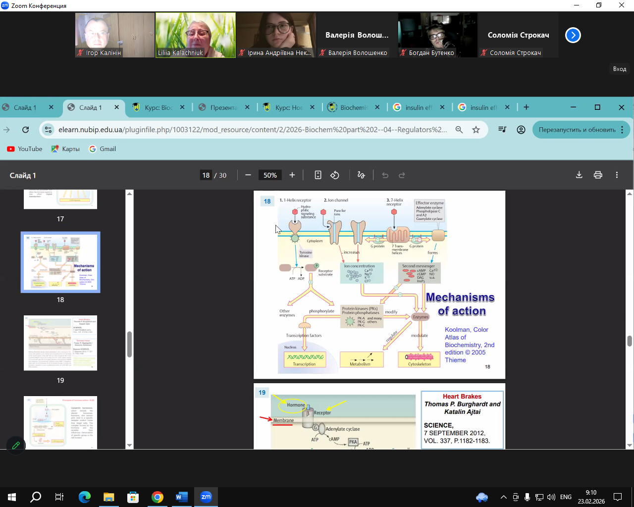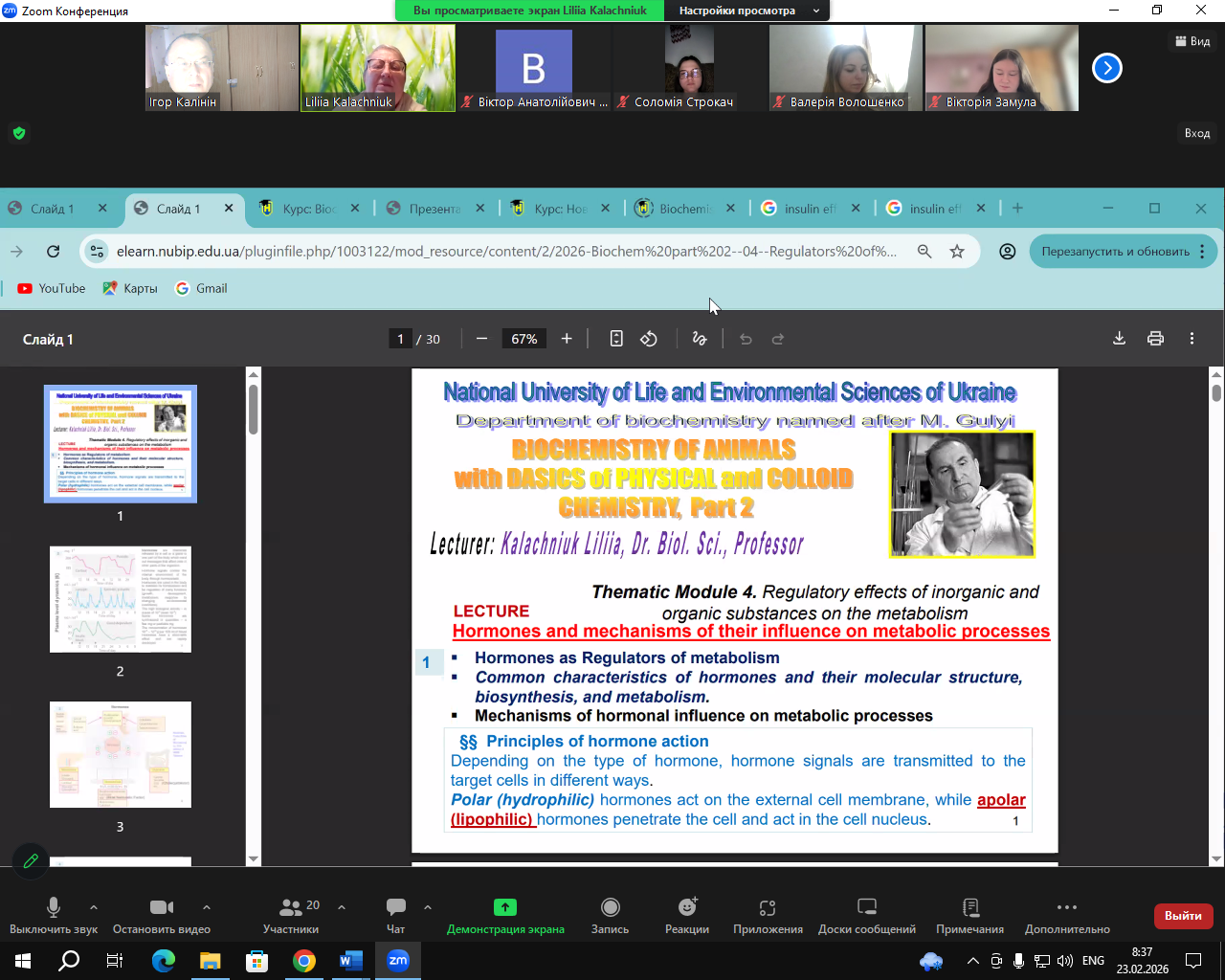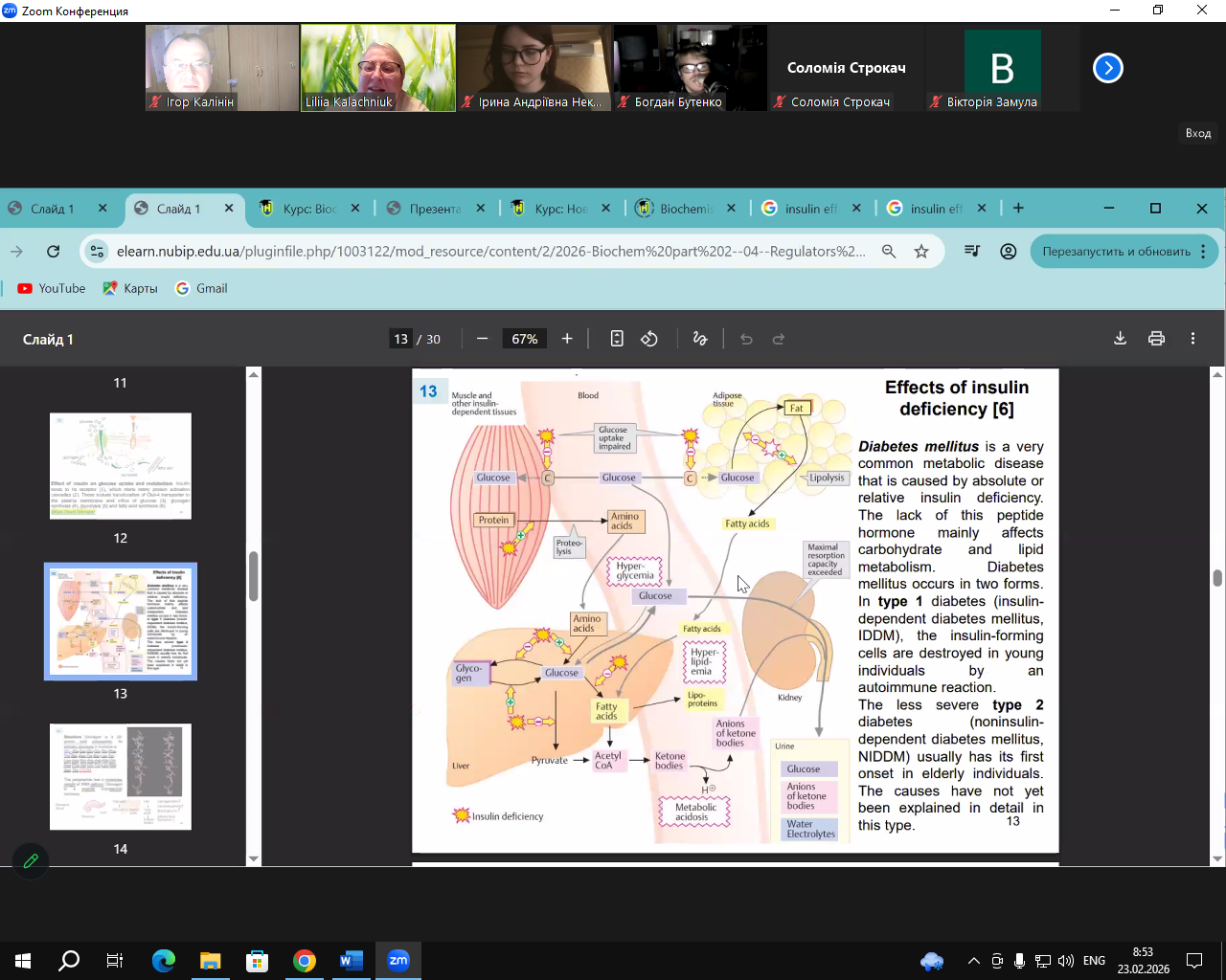 23 лютого 2026 року на 1 парі професор кафедри біохімії імені академіка М. Ф. Гулого, доктор біологічних наук, Калачнюк Лілія Григорівна прочитала відкриту лекцію з дисципліни «Biochemistry of animals with the basics of physical and colloid chemistry (Біохімія тварин з основами фізичної і колоїдної хімії)» для студентів 7 групи 2 курсу ОС «Магістр» спеціальність 211 «Ветеринарна медицина». На тему: «Hormones and mechanisms of their influence on metabolic processes» / Гормони та механізми їхнього впливу на метаболічні процеси».