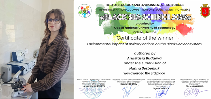 Особливо приємно відзначити, що за підсумками фінального етапу дипломом ІІІ ступеня нагороджено Анастасію БУДАЄВУ — студентку 1 курсу спеціальності Е2 «Екологія» факультету захисту рослин, біотехнологій та екології. Її наукова робота вирізнялася актуальністю тематики, глибоким науковим підходом, ґрунтовністю дослідження та високим рівнем презентації, що дозволило гідно представити університет на міжнародній арені та отримати високу оцінку експертів.